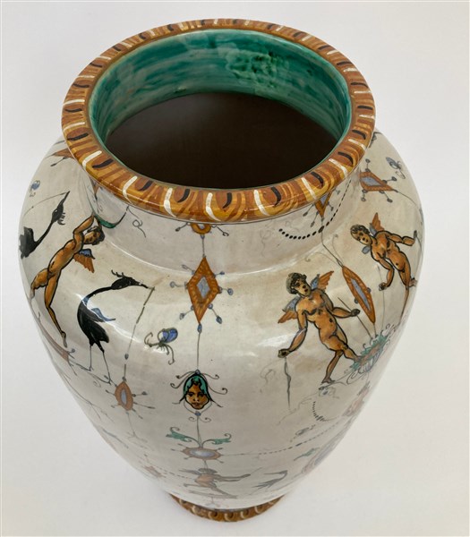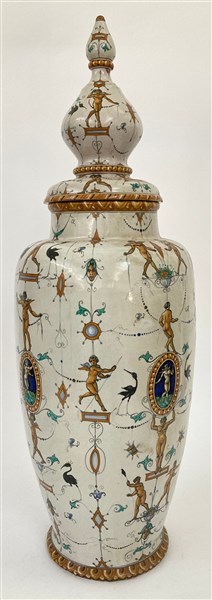Vaso a balaustro con coperchio. Anni '50. Ceramica policroma con decoro a grottesche. Marcato sotto la base. (h cm 85) (lievi difetti)