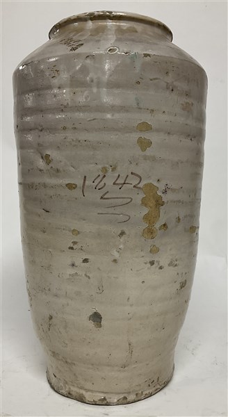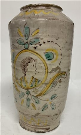 Manifattura spagnola, Talavera de la Reina. Grande albarello in maiolica policroma decorato con profilo di uomo, datato al retro 1842 (h. cm 45) (difetti)