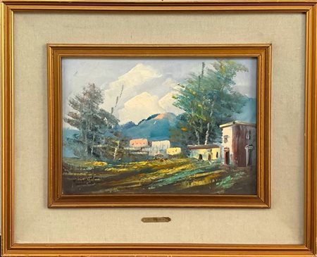 "Villaggio montano" olio su tela (cm 26x38) firmato in basso a sinistra