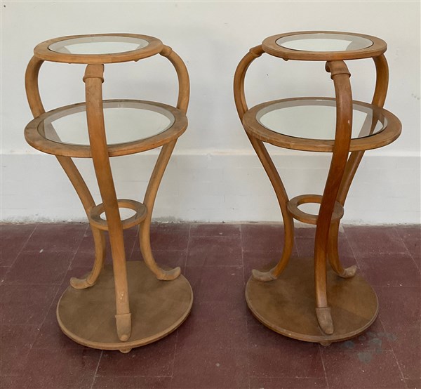 Coppia di Gueridon in legno e piani in vetro (cm 55x104x55)
