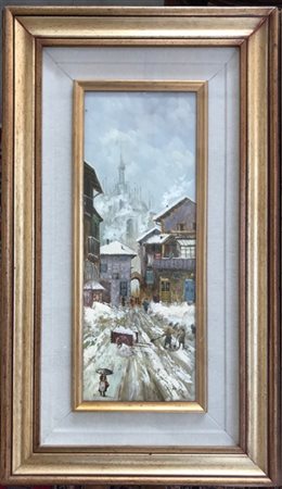 Lotto composto da due dipinti ad olio su masonite raffiguranti scorci di Milano (cm 40x14) firmati in basso.