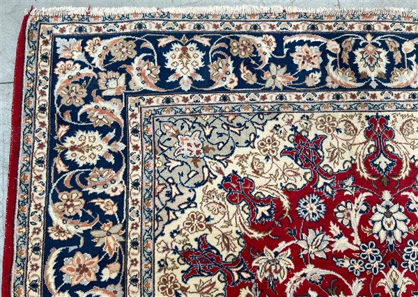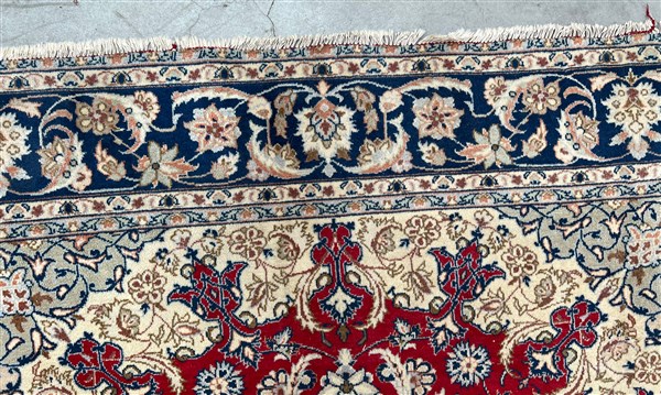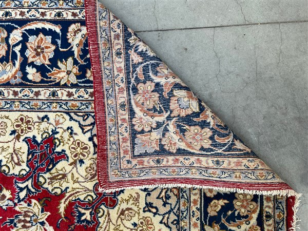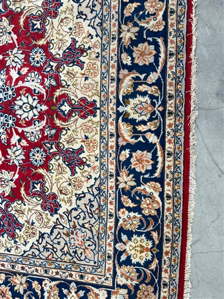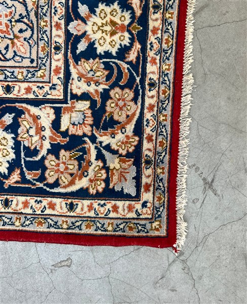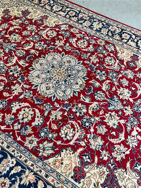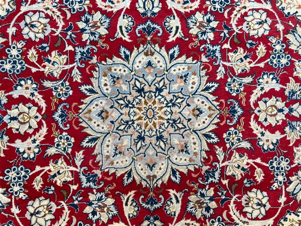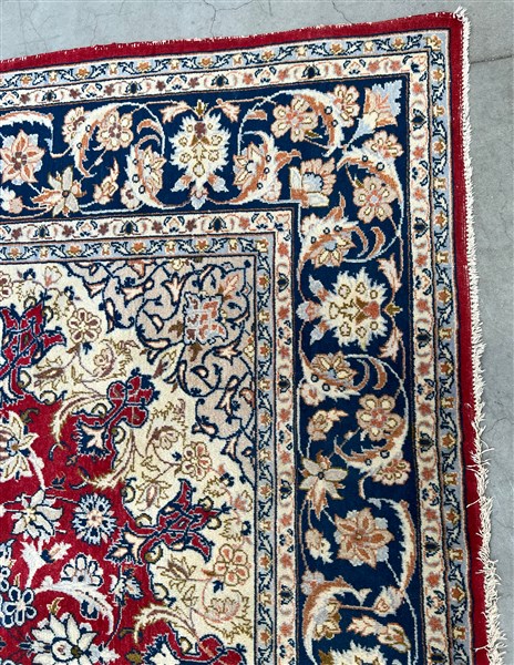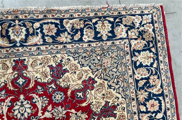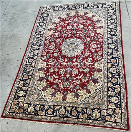 Tappeto Qum, Persia, secolo XX. Decoro con medaglione polilobato nei toni del beige, rosa, azzurro e blu su fondo rosso cosparso di piumaggi e rami fioriti (cm 345x242) (difetti)