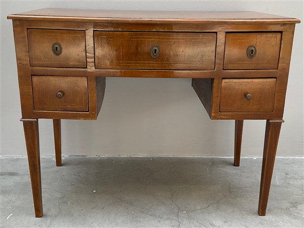 Scrivania da centro in legno lastonato e filettato a varie essenze con fronte a cinque cassetti, gambe rastremate, secolo XIX (cm 101 x 81 x 55) (difetti)