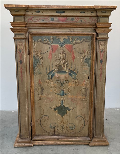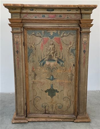 Credenza in legno ad un'anta di forma architettonica dipinta a figura di Santa entro grottesche (cm 91x128x39) (difetti)