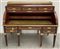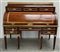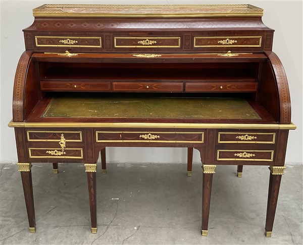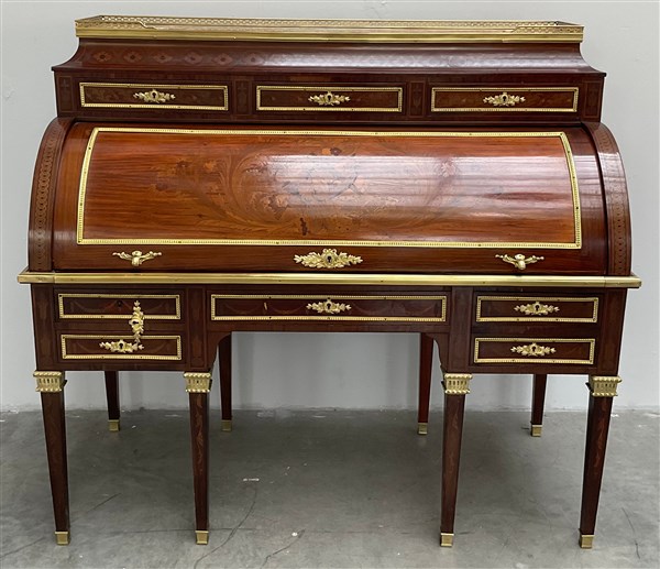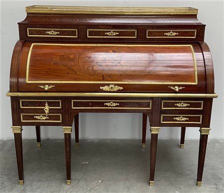 Scrivania a rullo in legni vari. La calatoia, intarsiata a strumenti musicali, di foglie e fiori entro cartella in metallo dorato, cela vani e tiretti. L'alzata a tre cassetti sormontata da ringhiera traforata e piano in marmo rosso. Quattro cassetti e segreti sul fronte. Otto gambe a obelisco rovesciato. Guarnizioni in metallo. Francia (cm 140x125x66) (difetti e mancanze)