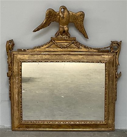 Piccola specchiera in legno intagliato e dorato con cimasa sormontata da pellicano e festoni, secolo XIX (cm 55x62) (difetti)