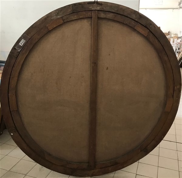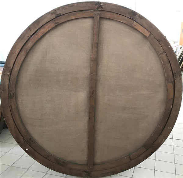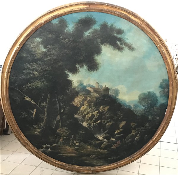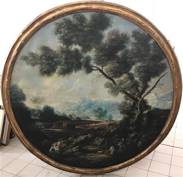 Scuola dell'inizio del sec XIX "Figure in un paesaggio" coppia di dipinti ad olio su tela (cm d 145) in cornici