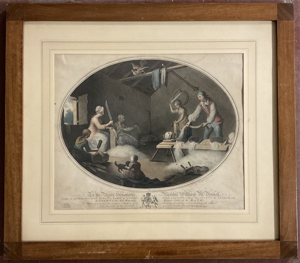 Incisione inglese del secolo XIX raffigurante la lavorazione tessile (cm 33x41) in cornice (difetti)