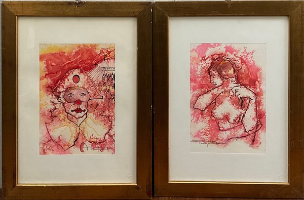Lotto composto da due tecniche miste su carta raffiguranti Nudo femminile con treccia e Pagliaccio, (circa cm 32x22) firmate in basso
