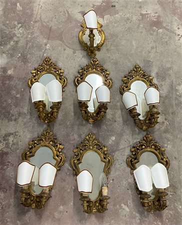 Gruppo di sei ventole a due luci di forma sagomata in legno intagliato, traforato e dorato a fregi e volute. Fondo a specchio. Unite ad una analoga ad una luce (cm 44x26) (difetti)