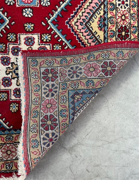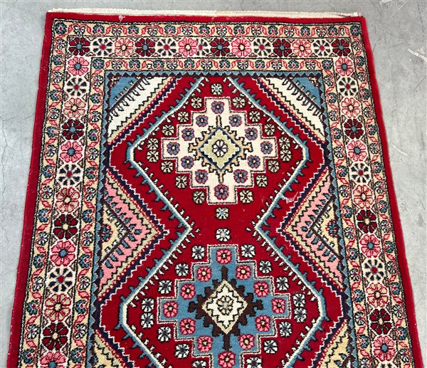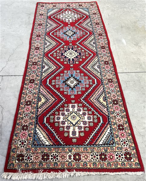 Tappeto passatoia, Romania, secolo XX. Decoro con cinque medaglioni romboidali policromi su fondo rosso (cm 280x109) (difetti)