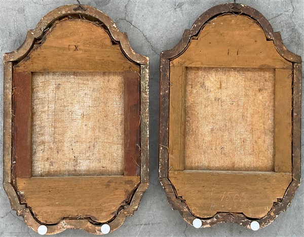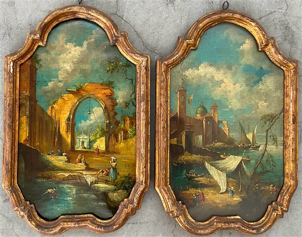 Coppia di dipinti raffiguranti marine con figure, dipinti alla maniera di Francesco Guardi, olio su tavola (cm 46x28,5 circa) in cornice sagomata