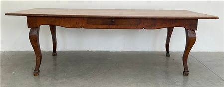 Tavolo di forma rettangolare ad un cassetto sottopiano con fascia gambe sagomate (cm 246x76x104) (difetti)