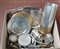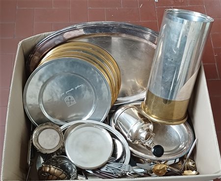 Cartone contenente oggetti di diverso uso in metallo argentato