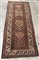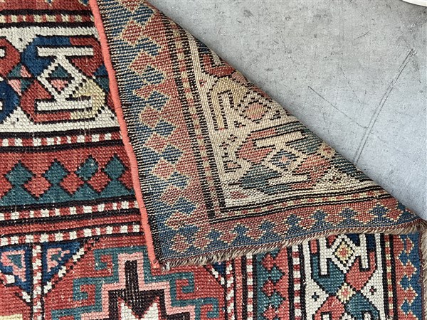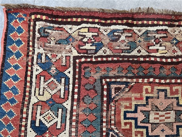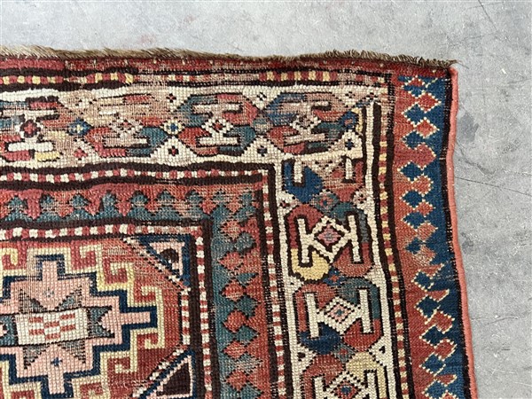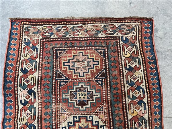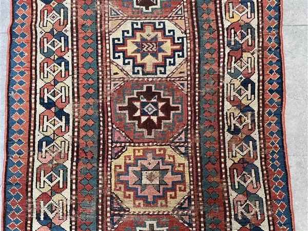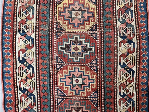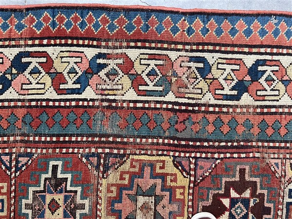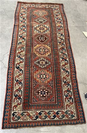 Tappeto Gandjiè, Caucaso, fine secolo XIX. Decoro con Memling Gül policromi entro una bordura Medachil rossa e verde (cm 232x102) (difetti e rapature)