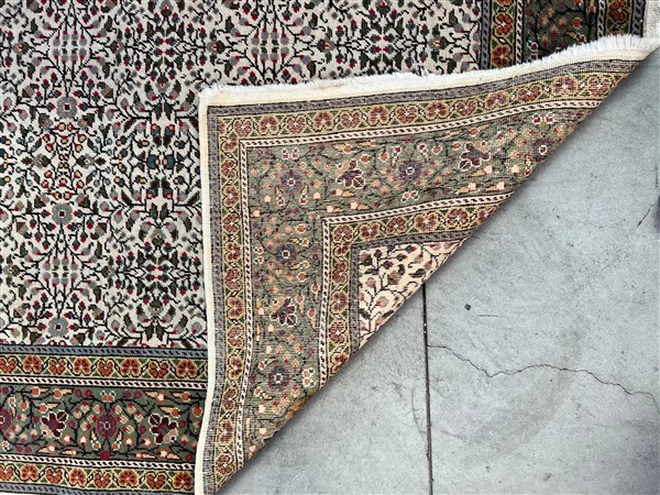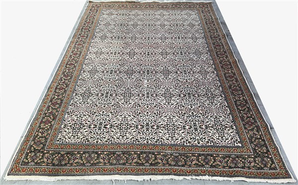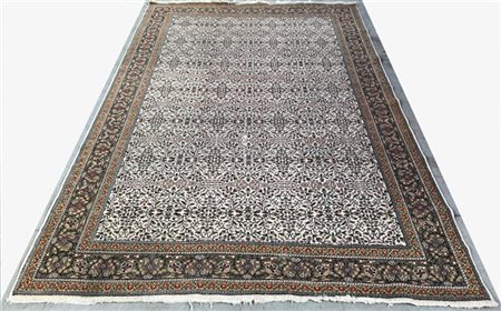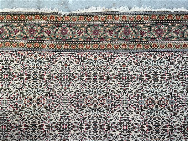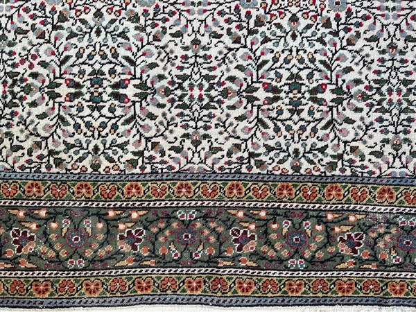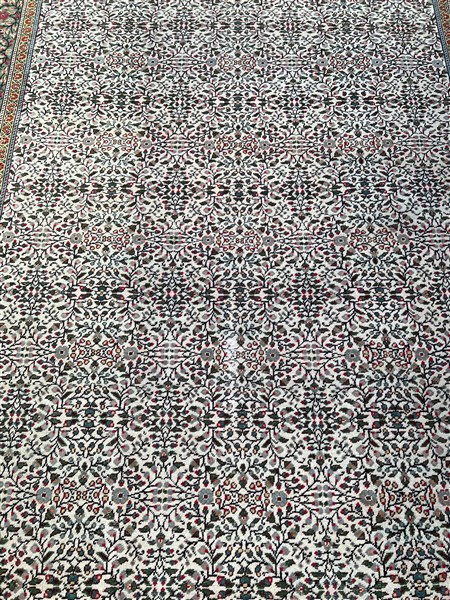Tappeto Kaiseri, Anatolia, prima metà secolo XX. Decoro all over ispirato ai disegni di William Morris nei toni del verde, rosa e marrone su fondo bianco (cm 290x196) (lievi difetti)
