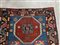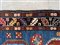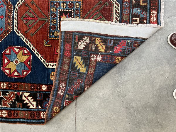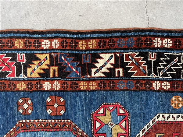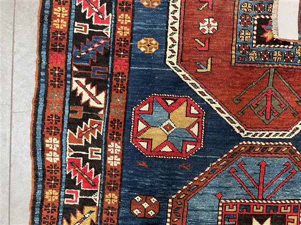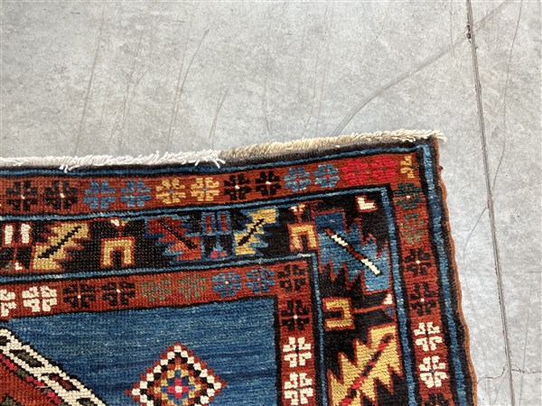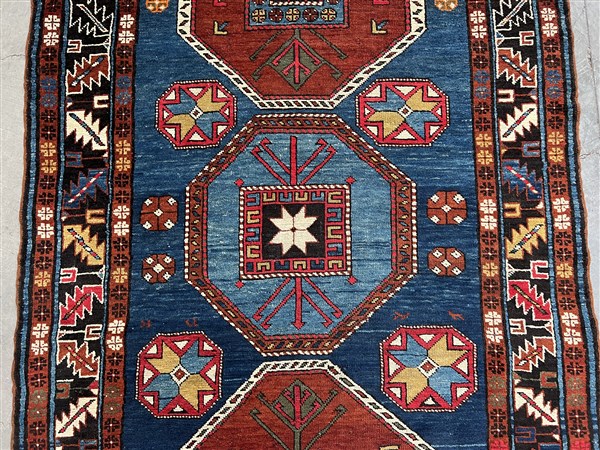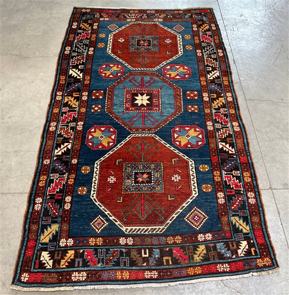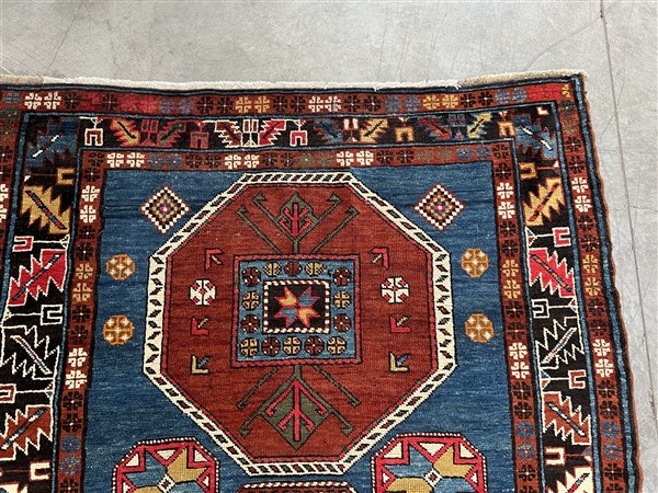 Tappeto Karabagh, Caucaso, inizio secolo XX. Decoro con tre medaglioni ottagonali, due a fondo ruggine e uno a fondo azzurro, con all'interno motivi geometrici stilizzati in policromia. Campo color azzurro. Bordura con foglie dentate e calici su fondo marrone scuro (cm 222x132) (lievi difetti)