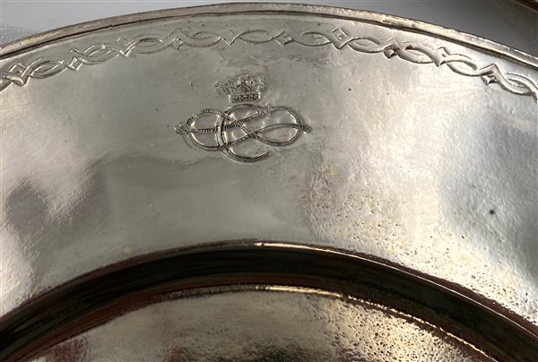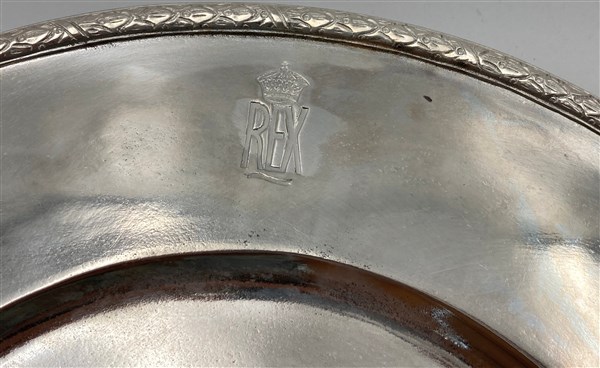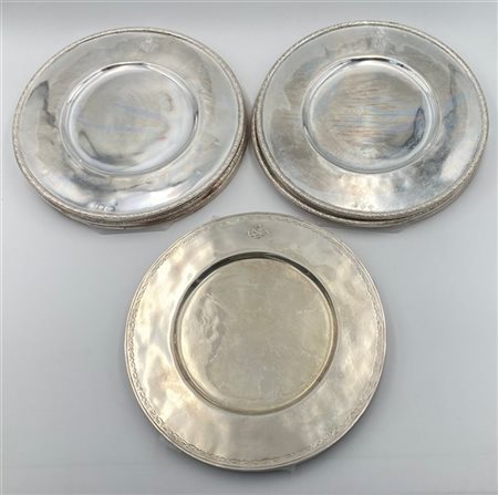 Cartone contenente numerosi sottopiatti in metallo argentato, alcuni marcati Re