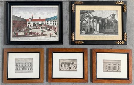 Lotto composto da cinque antiche incisioni raffiguranti edifici milanesi, misure diverse, in cornici (difetti)