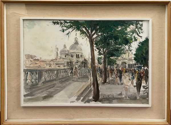 "Paesaggio con balaustra e cattedrale sullo sfondo" tecnica mista (cm 50x70) firmato in basso a destra