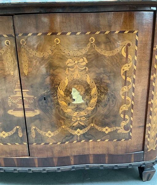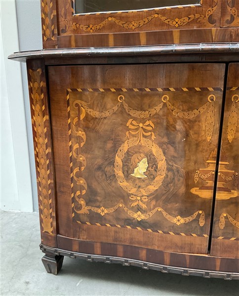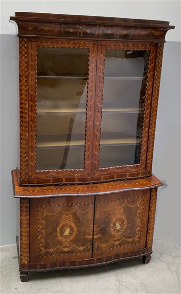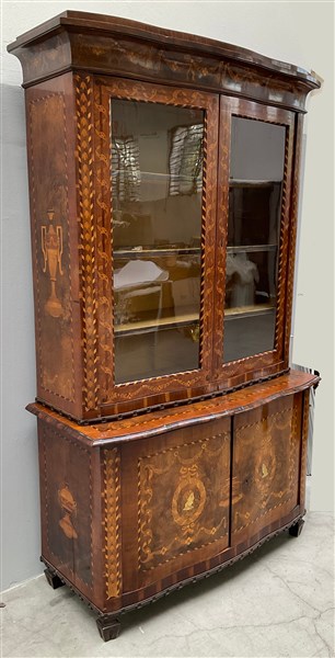 Vetrina intarsiata in legni vari di forma mossa. Parte inferiore a due ante centrate da profili in osso entro ghirlande e festoni. Parte superiore a due ante di simil decoro. Fianchi decorati da vasi (cm 130x215x59) (restauri)