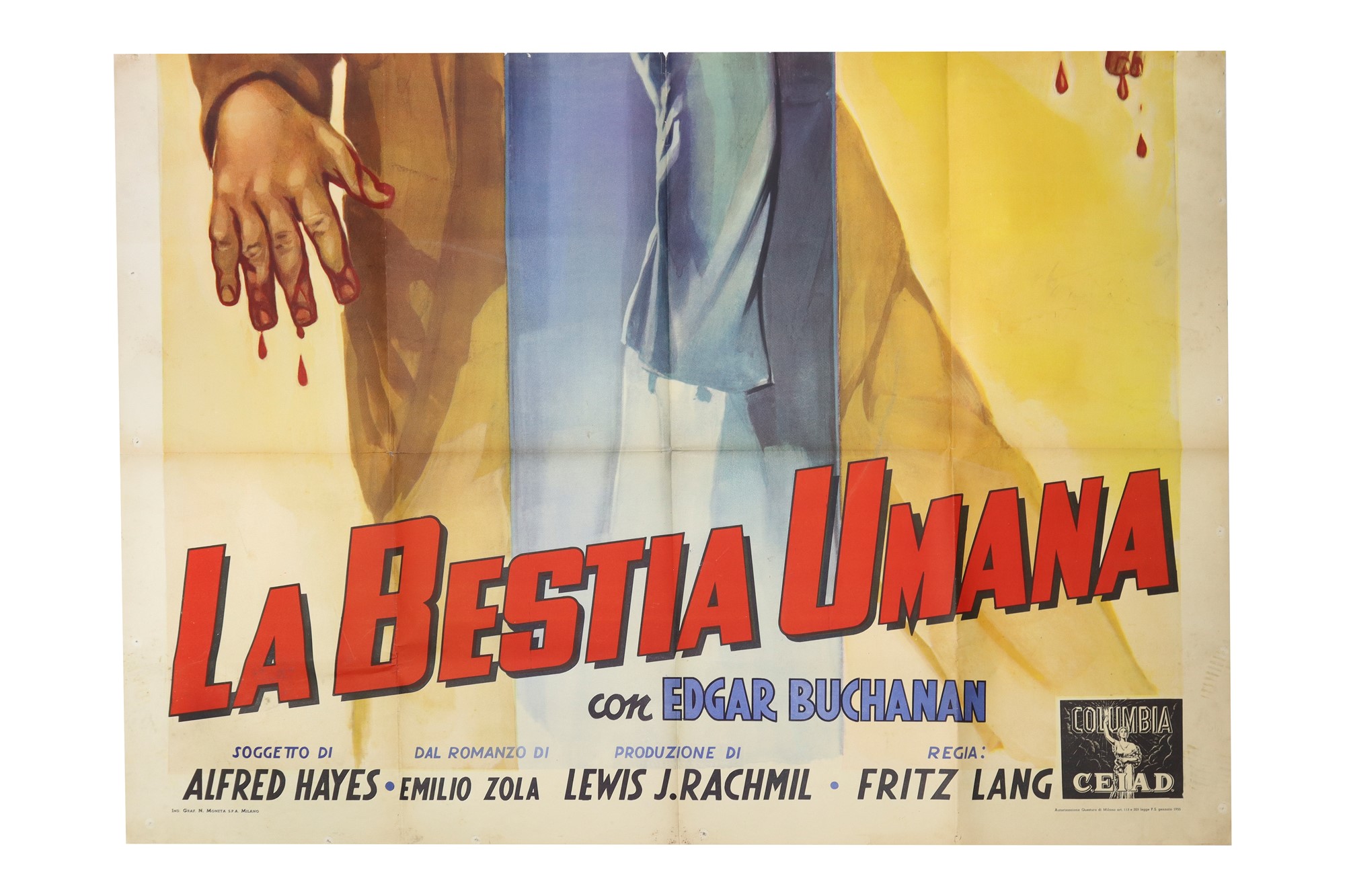 Manifesto ''La Bestia Umana''cm 140 x cm 200stampa offsetRitoccato e incollato con nastro. Prima edizione italiana 1955. Autore: Capitani. Presente nastro sul retro