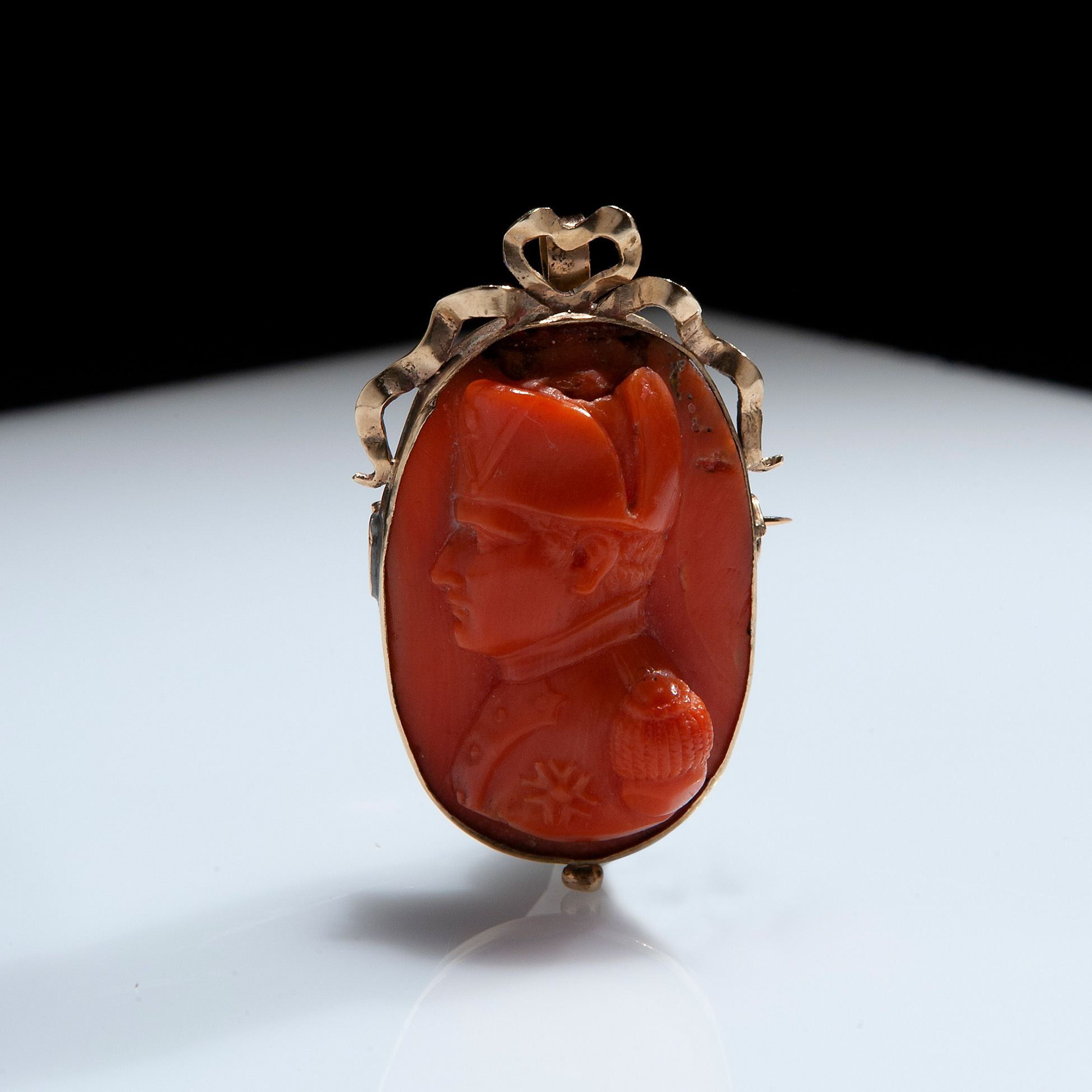 Spilla in oro e corallo inciso, Napoli 1815 In oro 18 kt, nel cammeo è raffigurato il profilo di Napoleone. Dimensioni complessive 4,5x2,5x0,8 cm., presenti difetti