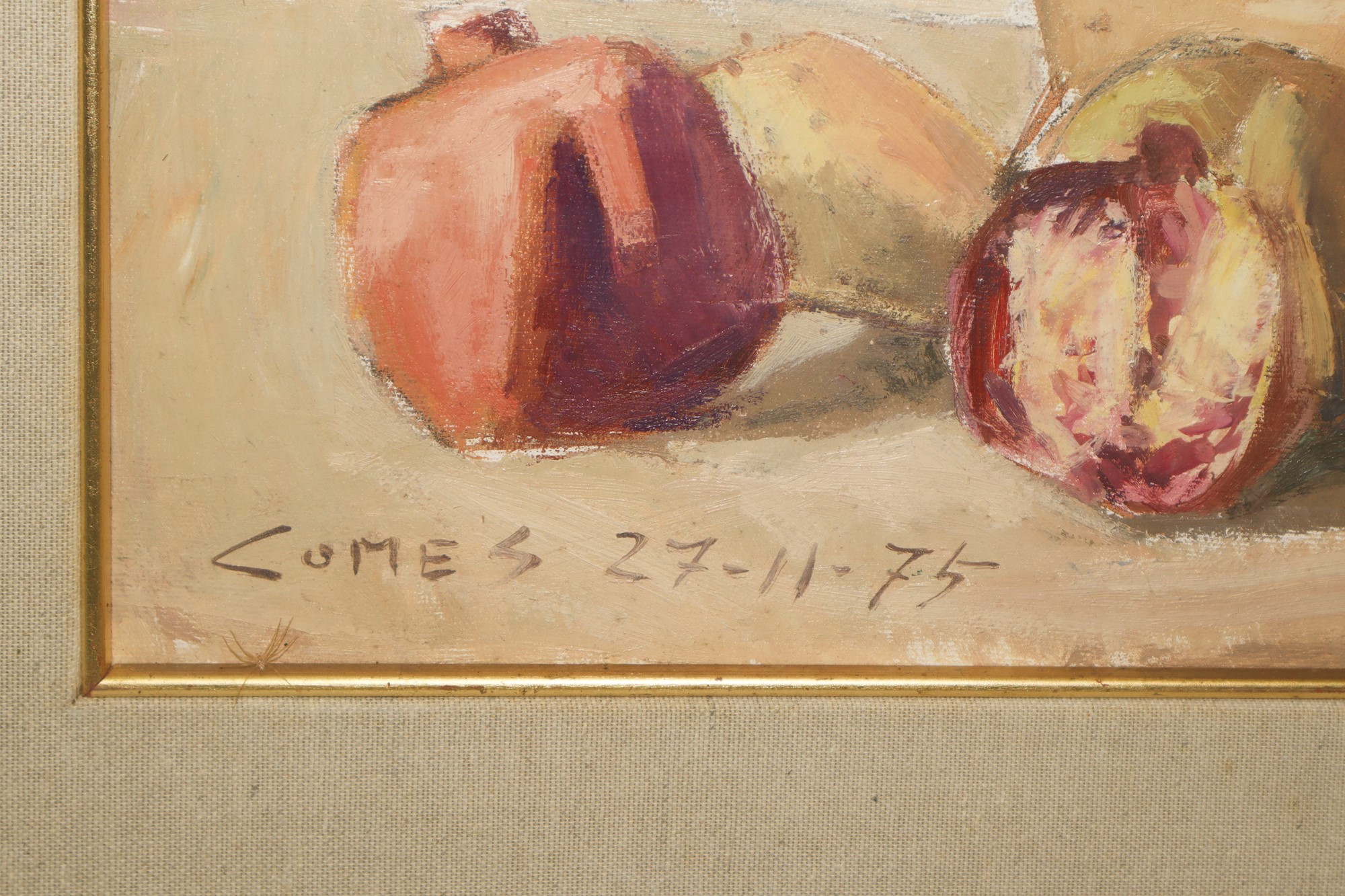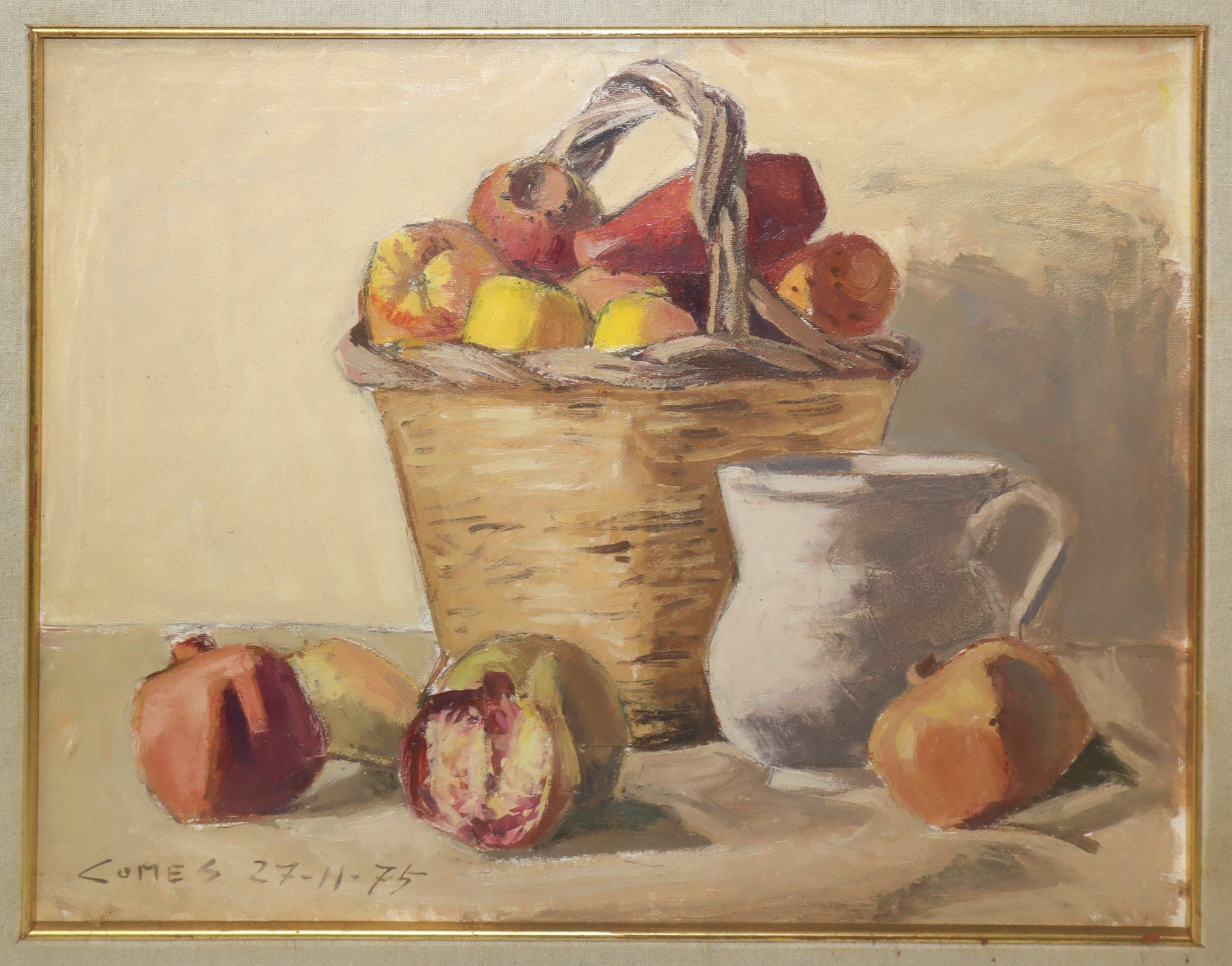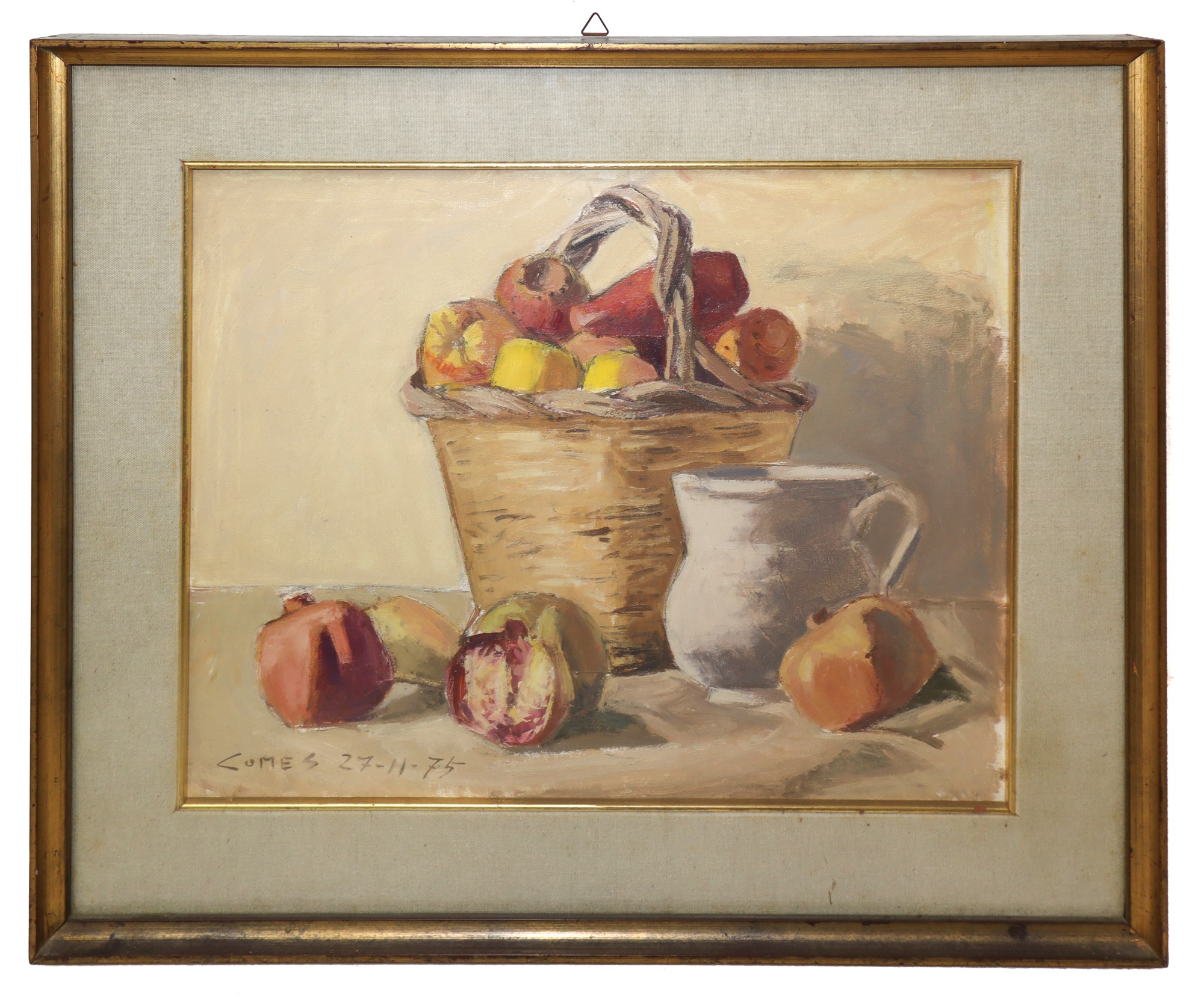 cm 39 x cm 49, in cornice cm 54 x cm 64 Natura morta di melograni e fichi d'India Olio su tela Firmato e datato 27-11-75 in basso a sinistra
