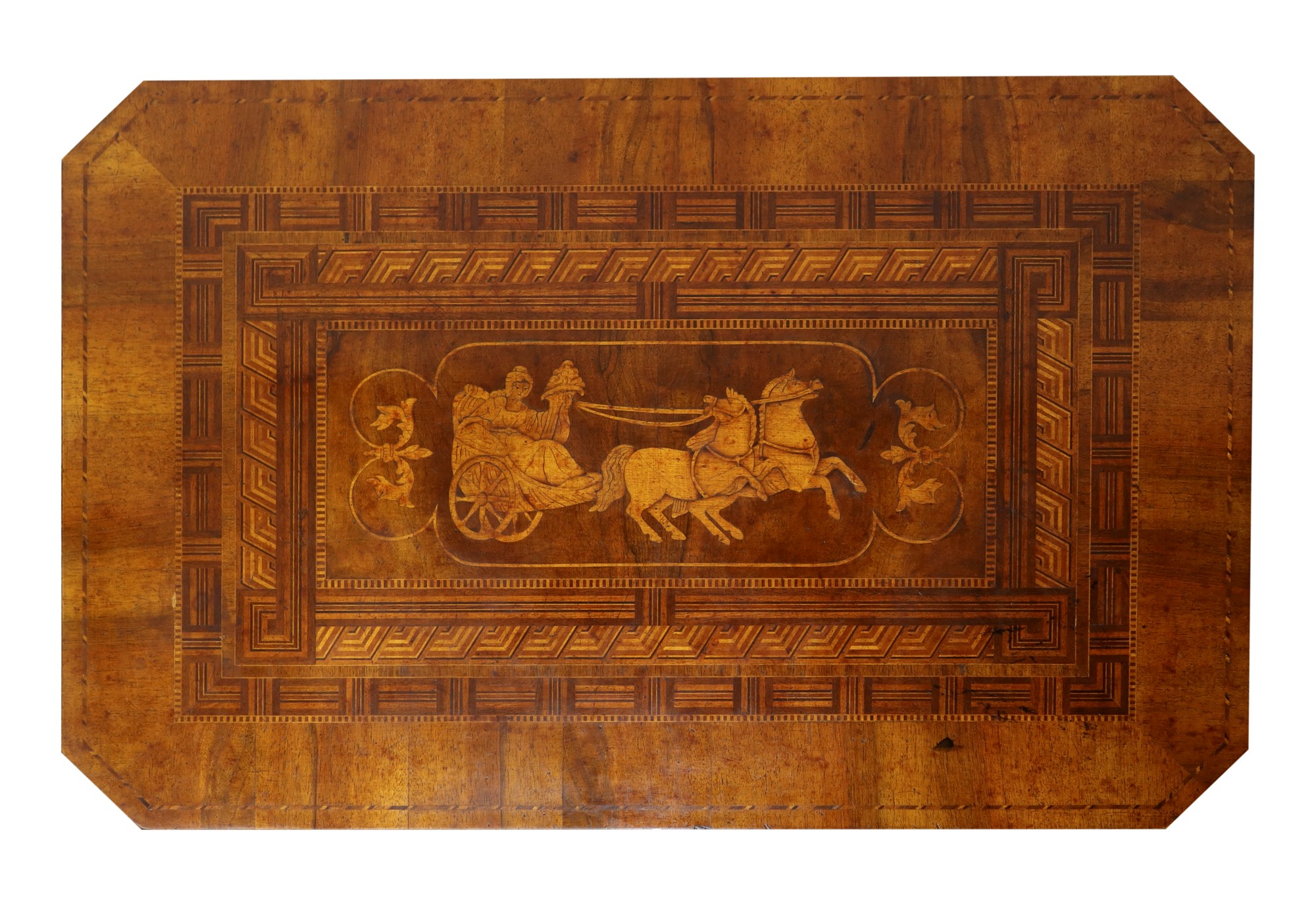 h cm 75 x cm 90 x cm 60 Tavolo rettangolare in legno di noce Piedi a 4 razze, piano interamente intarsiato in legni diversi, con centrale raffigurante diga romana