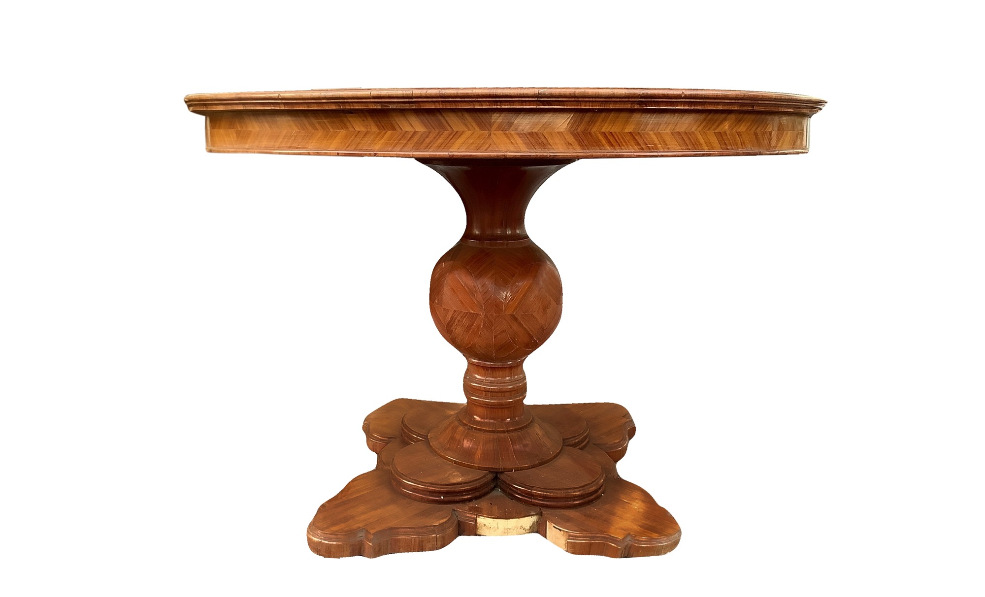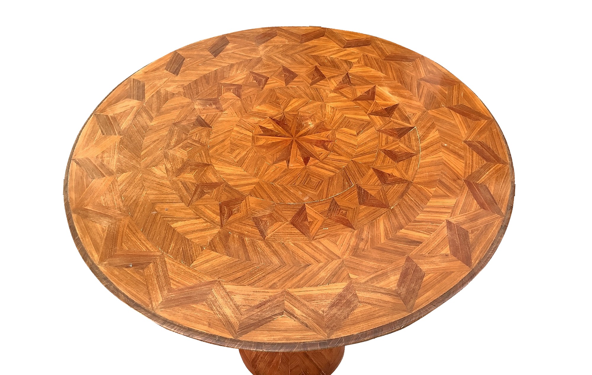 Tavolo tondo in legno di mogano con piede a quadrifoglio e piano intarsiato, Early 20th century