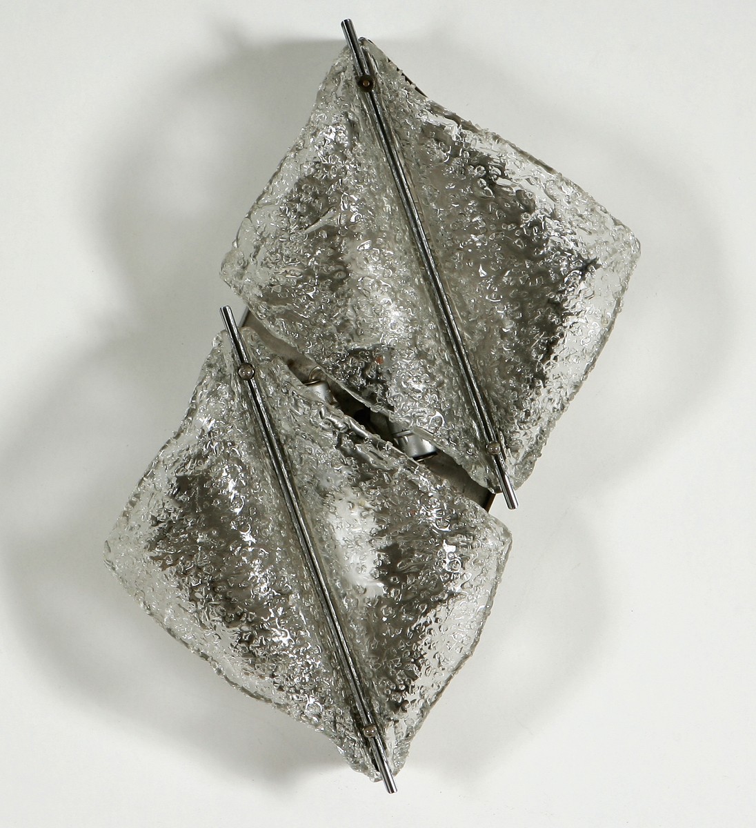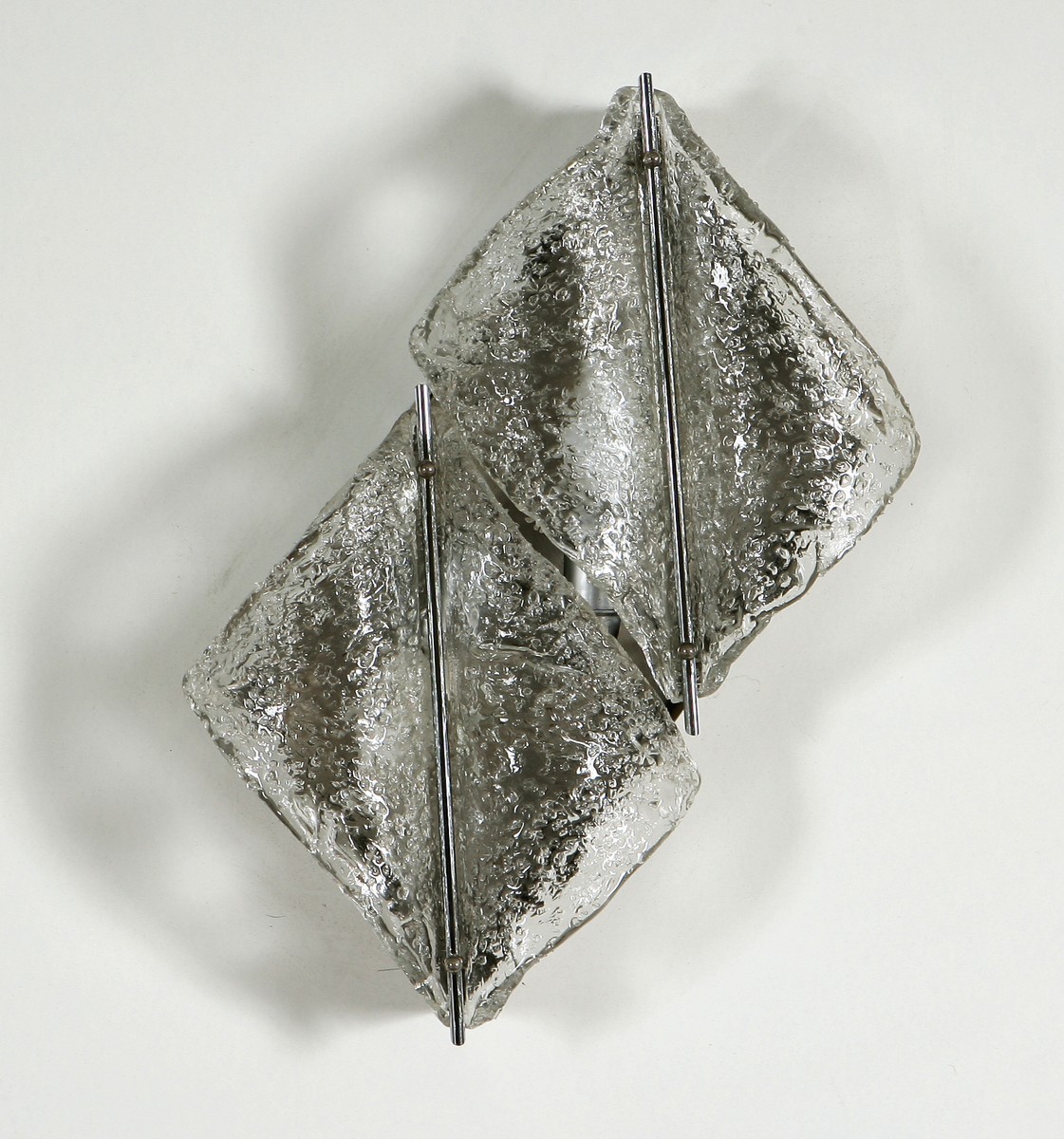 PRODUZIONE ITALIANA - ITALIAN WORK. Coppia di lampade da parete. Diffusori in vetro soffiato, struttura in metallo cromato. Pair of wall lamps.Blown glass diffusers, structure in chromed metal. Metallo e vetro. Cm 55x55x11. 1970 ca.