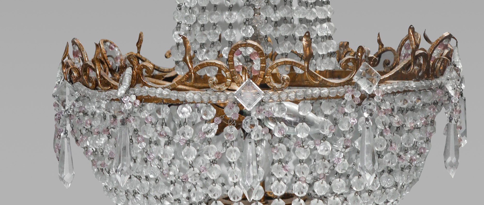 h cm 100, diametro cm 50 Lampadario con struttura in ottone dorato a 6 luci Con brindoli e sfere sfaccettate