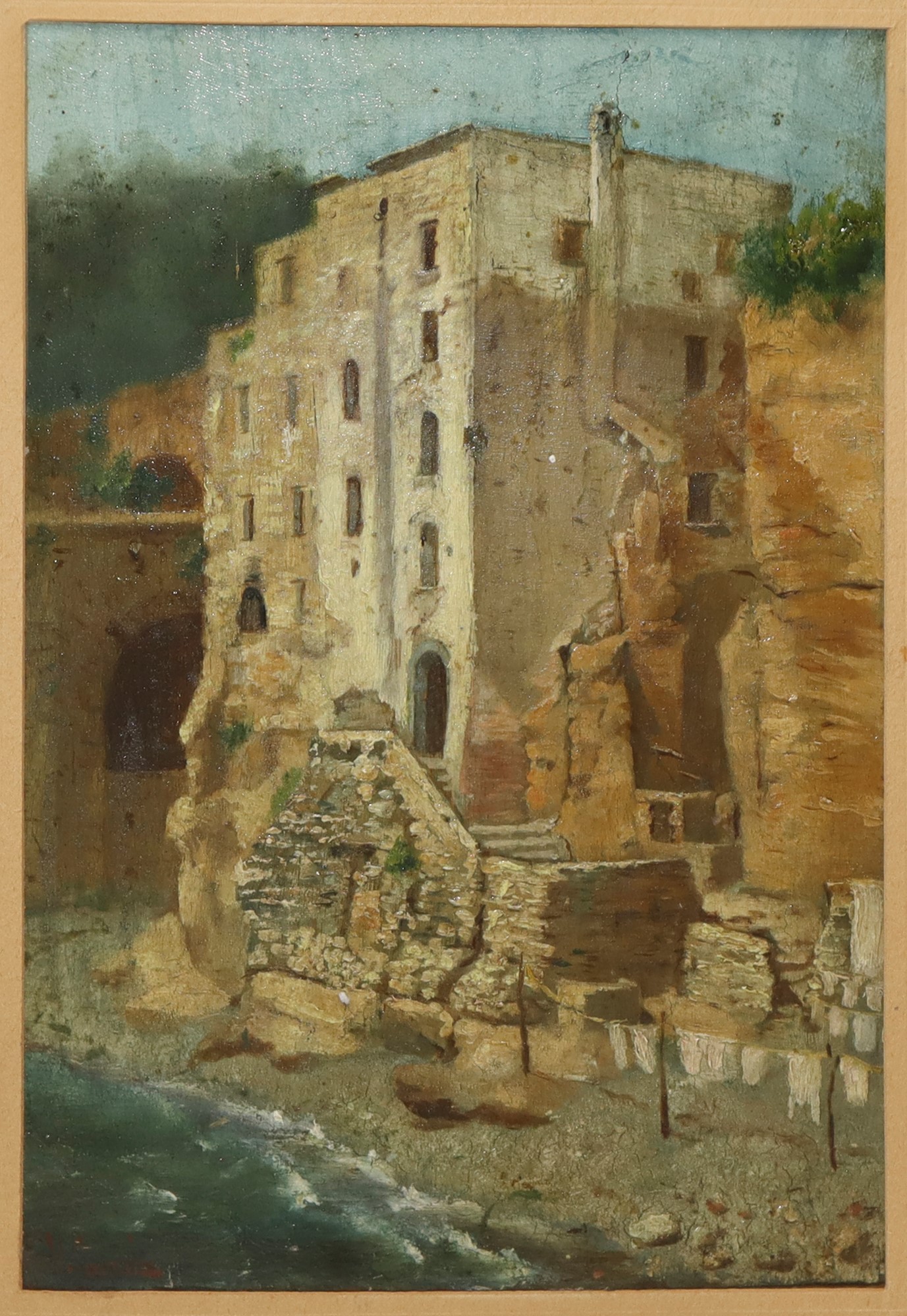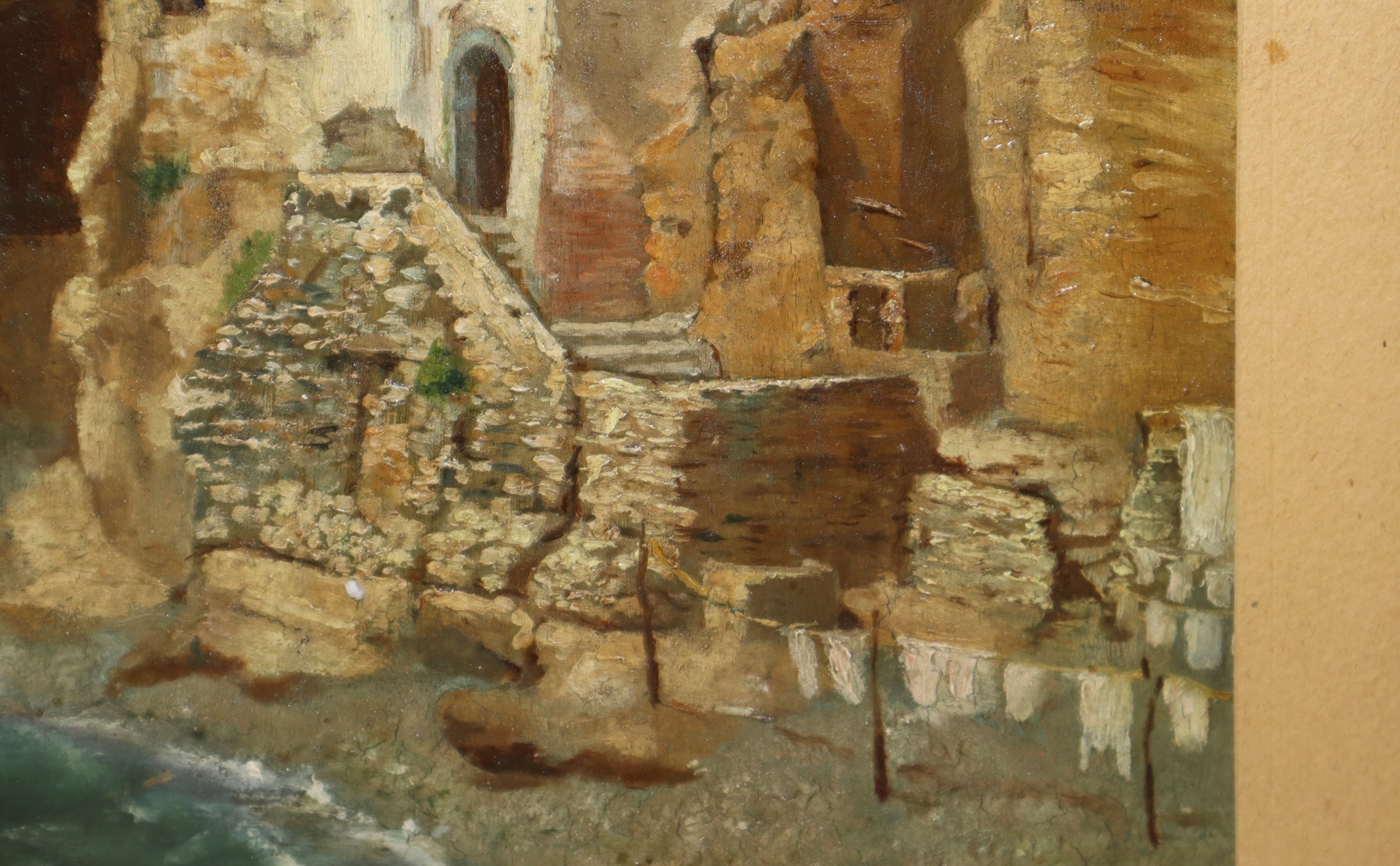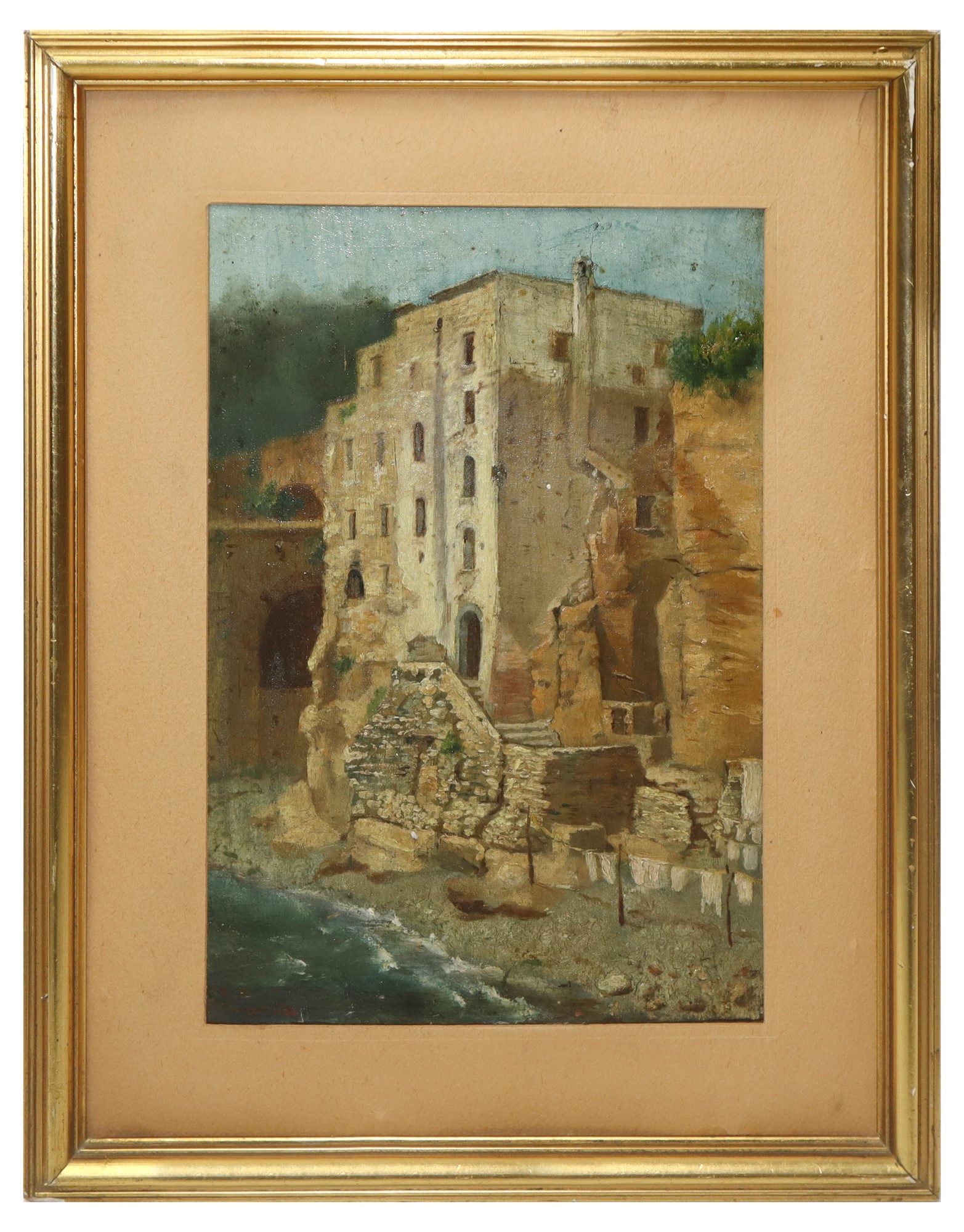 Cm 28x18,5, in cornice cm 38x29 Paesaggio costiero Dipinto ad olio su tavola Firmato in basso a sinistra. Provenienza Galleria Antichità Errico (Napoli).