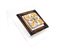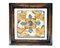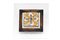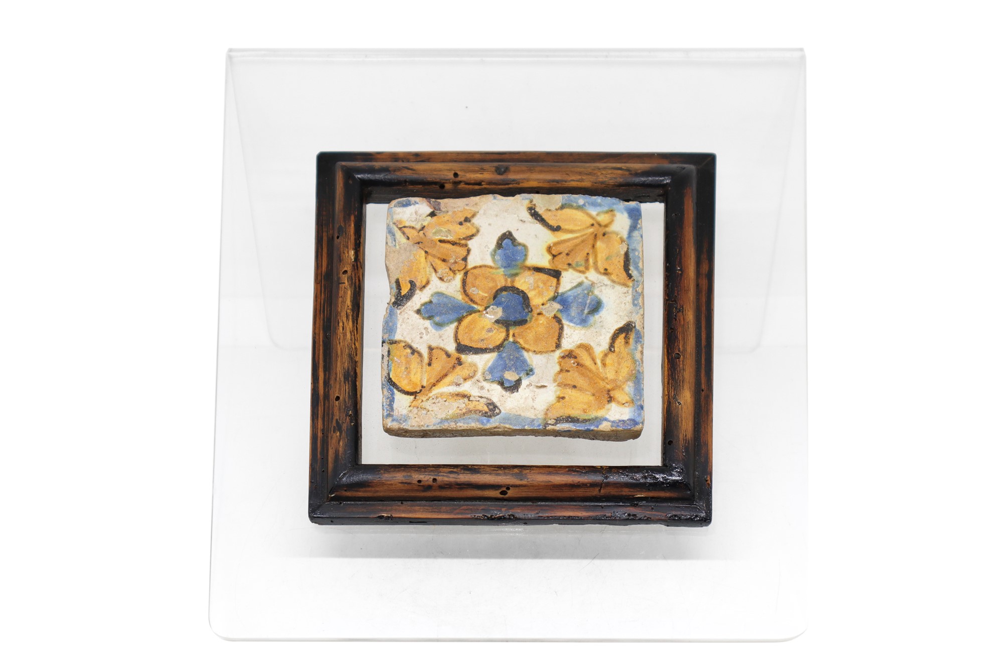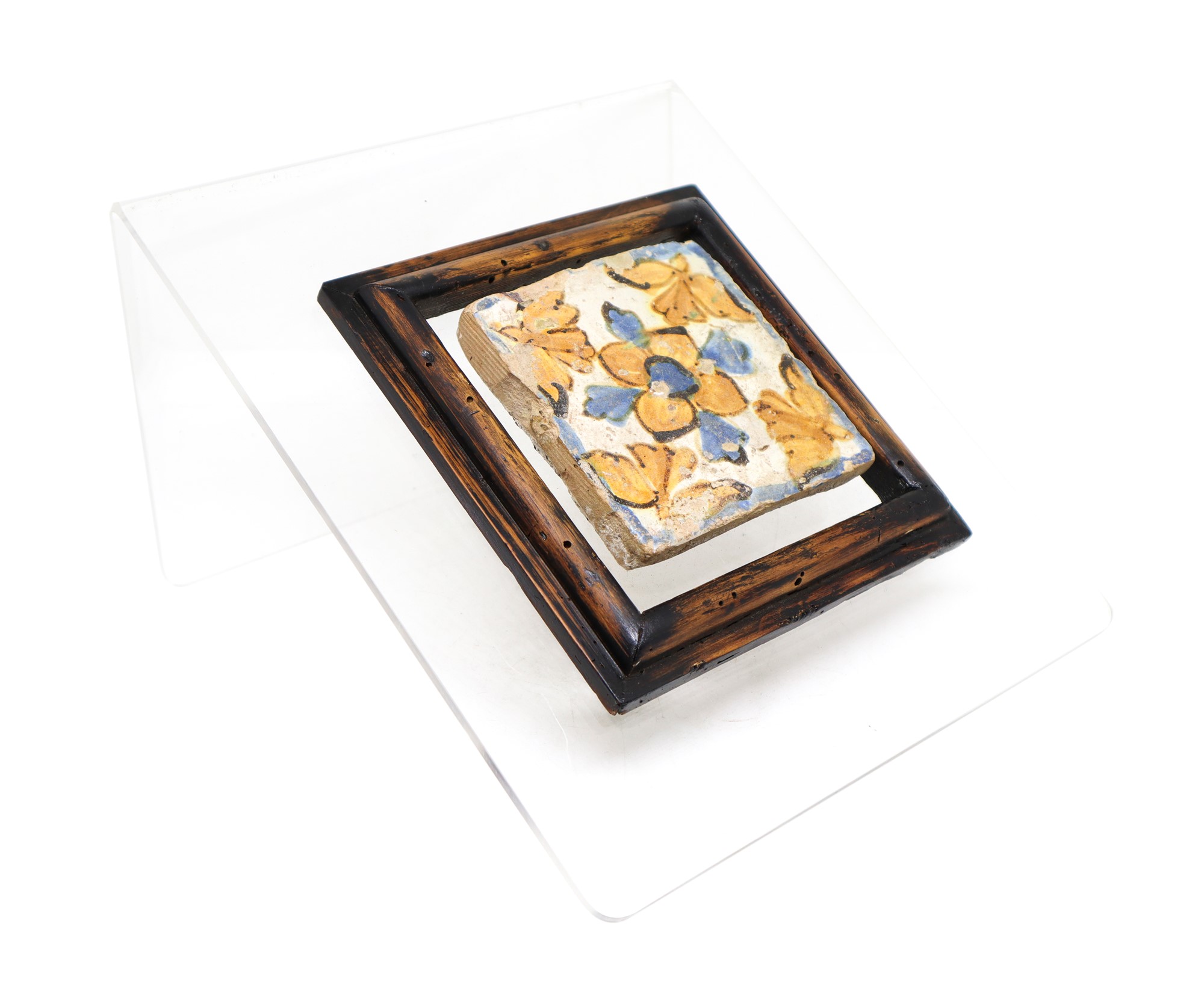Cm 10x10, montanta su base in plexiglass con cornice in legno (cm 28x24) Tozzetto in maiolica di Caltagirone Con decoro floreale nei toni del giallo ed azzurro. Su supporto trasparente