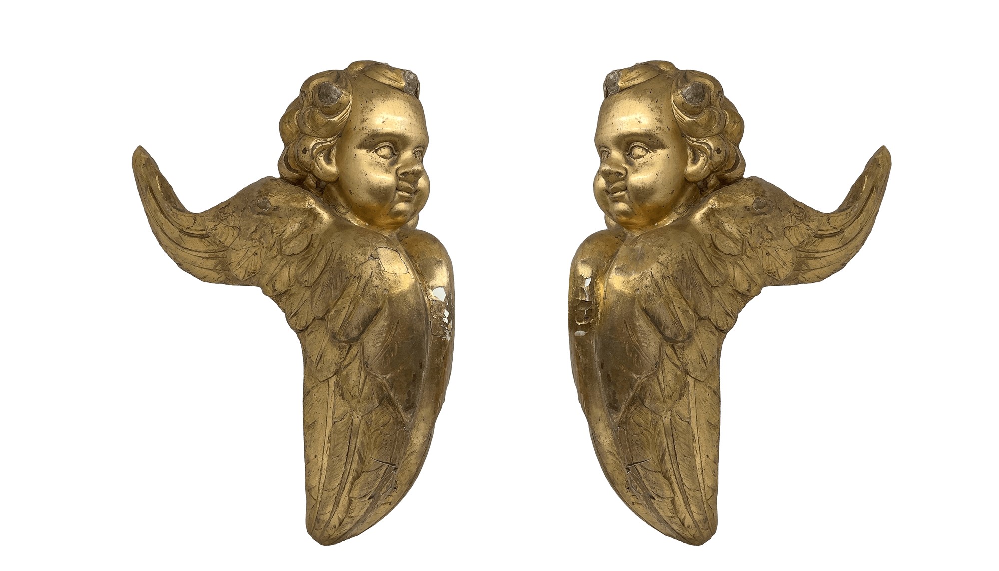 h cm 29; profondità cm 21 Coppia di angeli alati Legno gessato e dorato a foglia Di provenienza siciliana