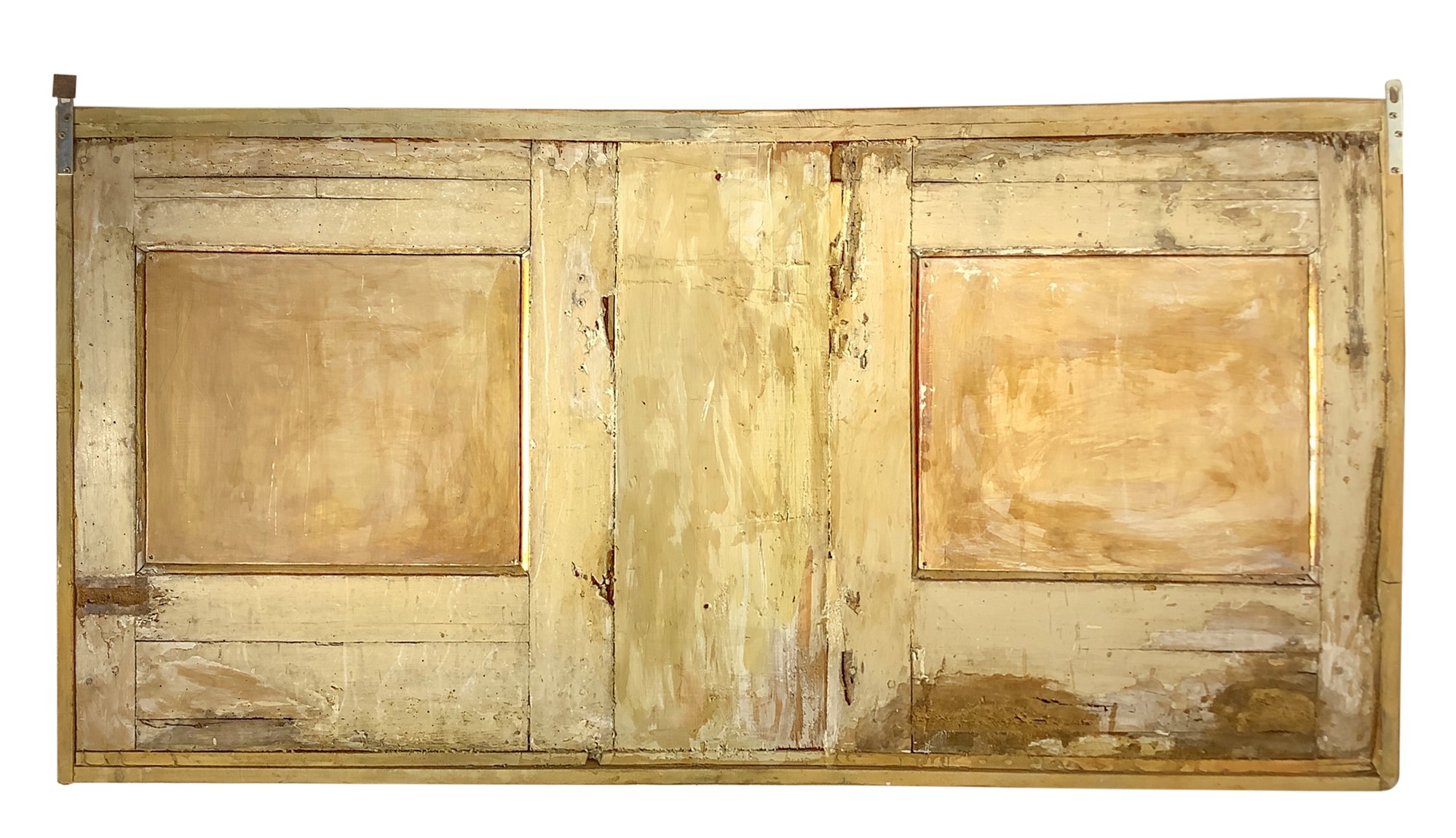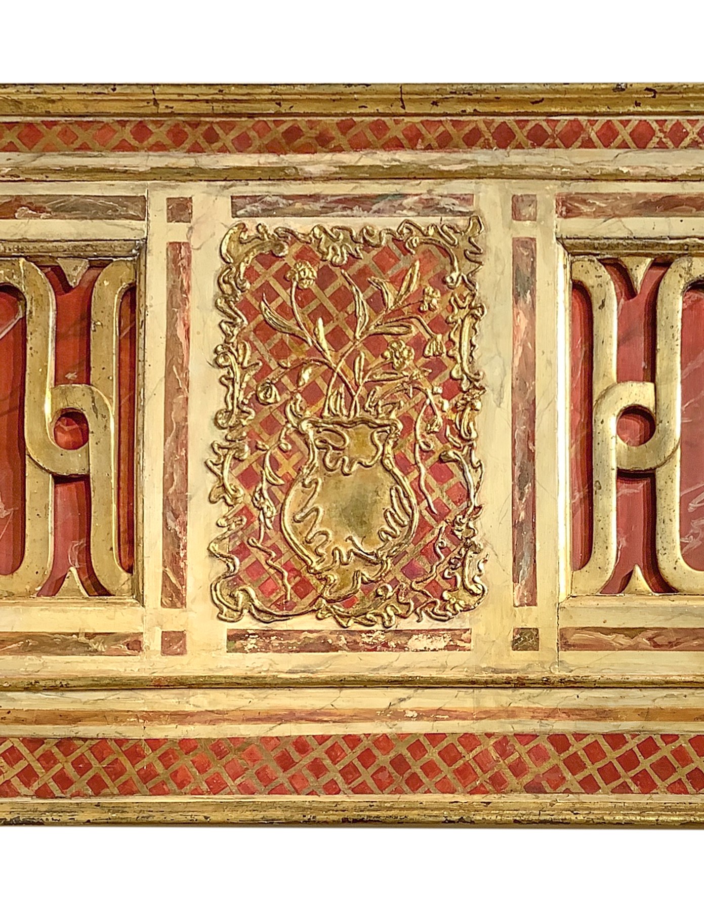 cm 170 x cm 87 Boiserie in legno policromo Legno intagliato e dipinto Di forma rettangolare con dentro cornice dorata, base in finto marmo colore bordeaux, applicazioni di intagli floreali dorati.