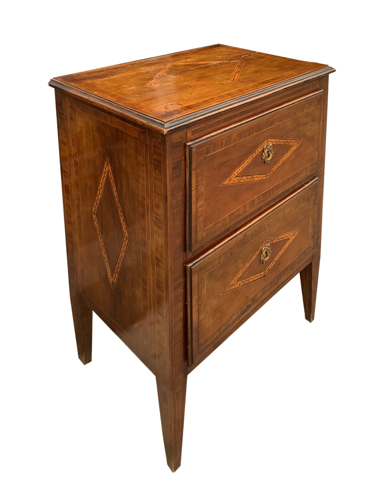 Comodino a due cassetti tardo Luigi XVI in legno di noce con losanghe al fronte, al piano e ai lati e piedi tronco piramidali, nineteenth century
