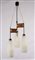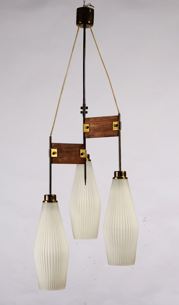 Lampadario di produzione italiana. Chandelier of Italian production. Vetro, ottone e legno. Cm 36x103. 1920.