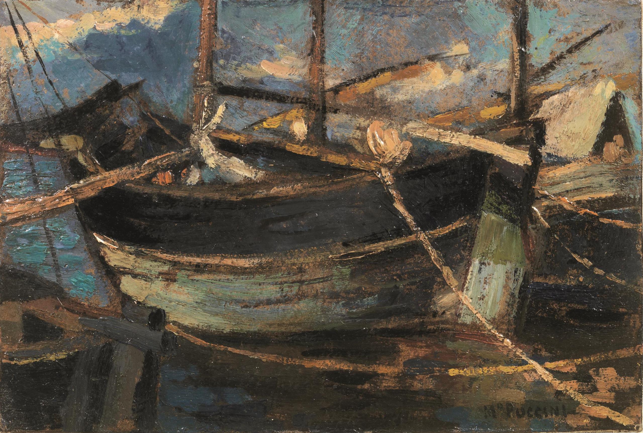 Mario Puccini(Livorno 1869 - Firenze 1920)BARCONE IN PORTOolio su cartoncino,...