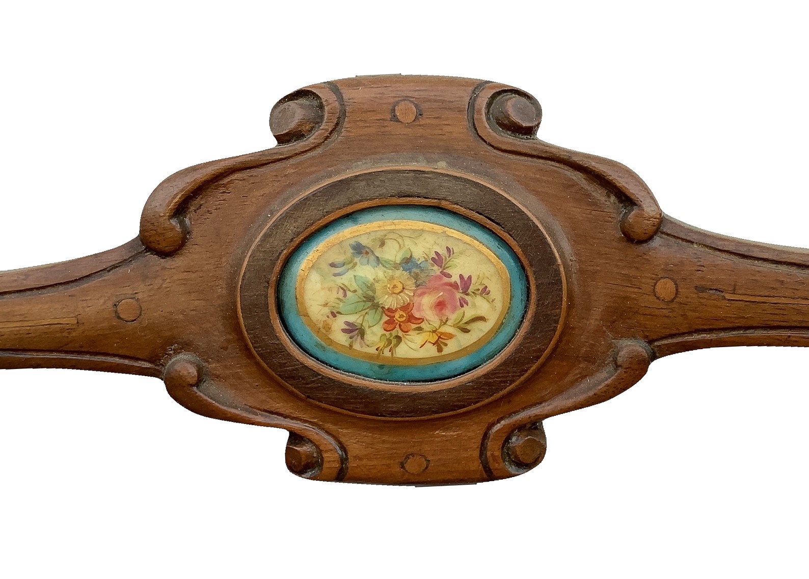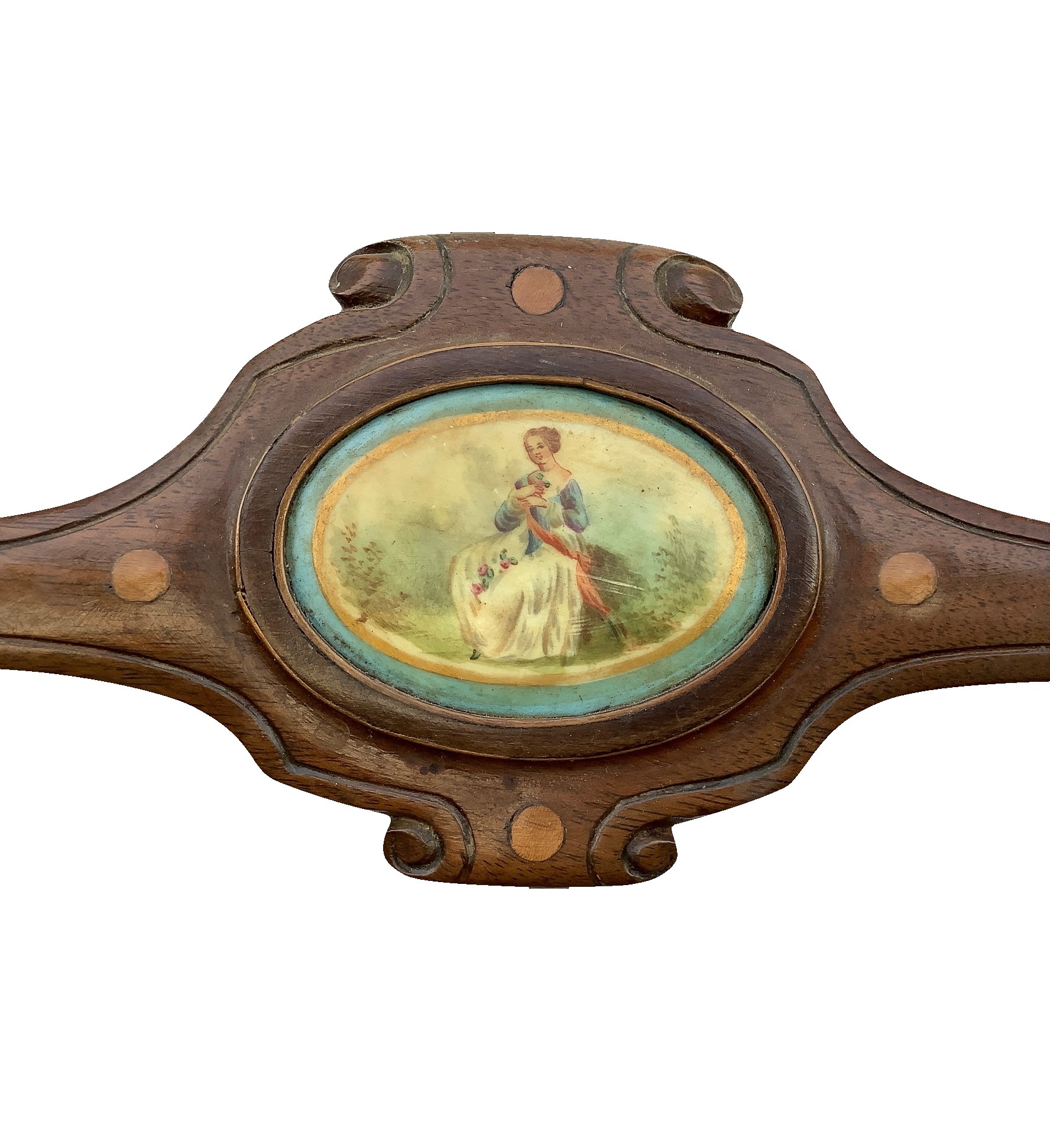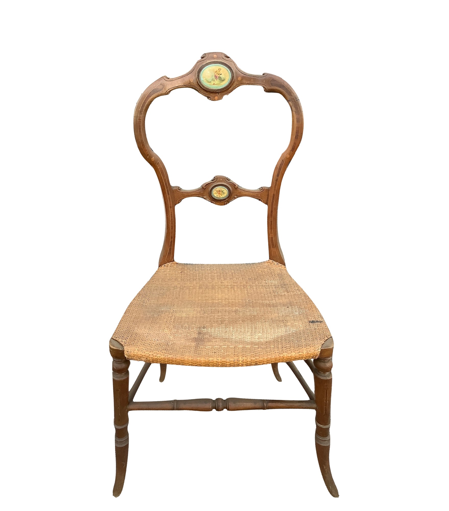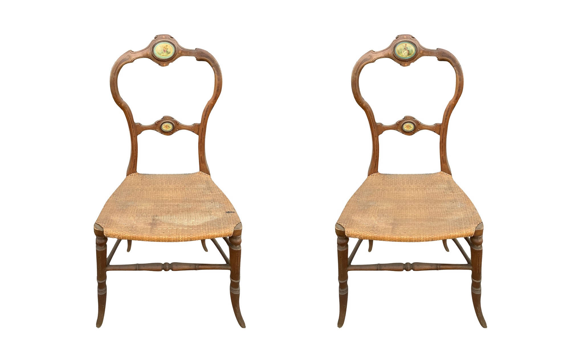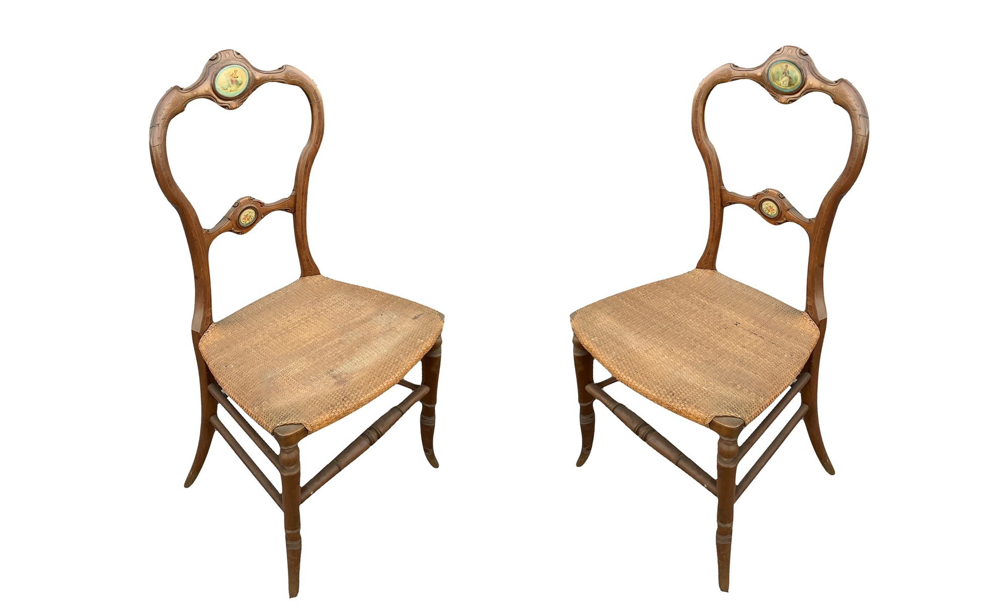 cm. 85 x 41 x 39 Coppia di sedie in legno Seduta e tamburo in paglia di Vienna. Spalliere con 2 miniature raffiguranti scene di genere