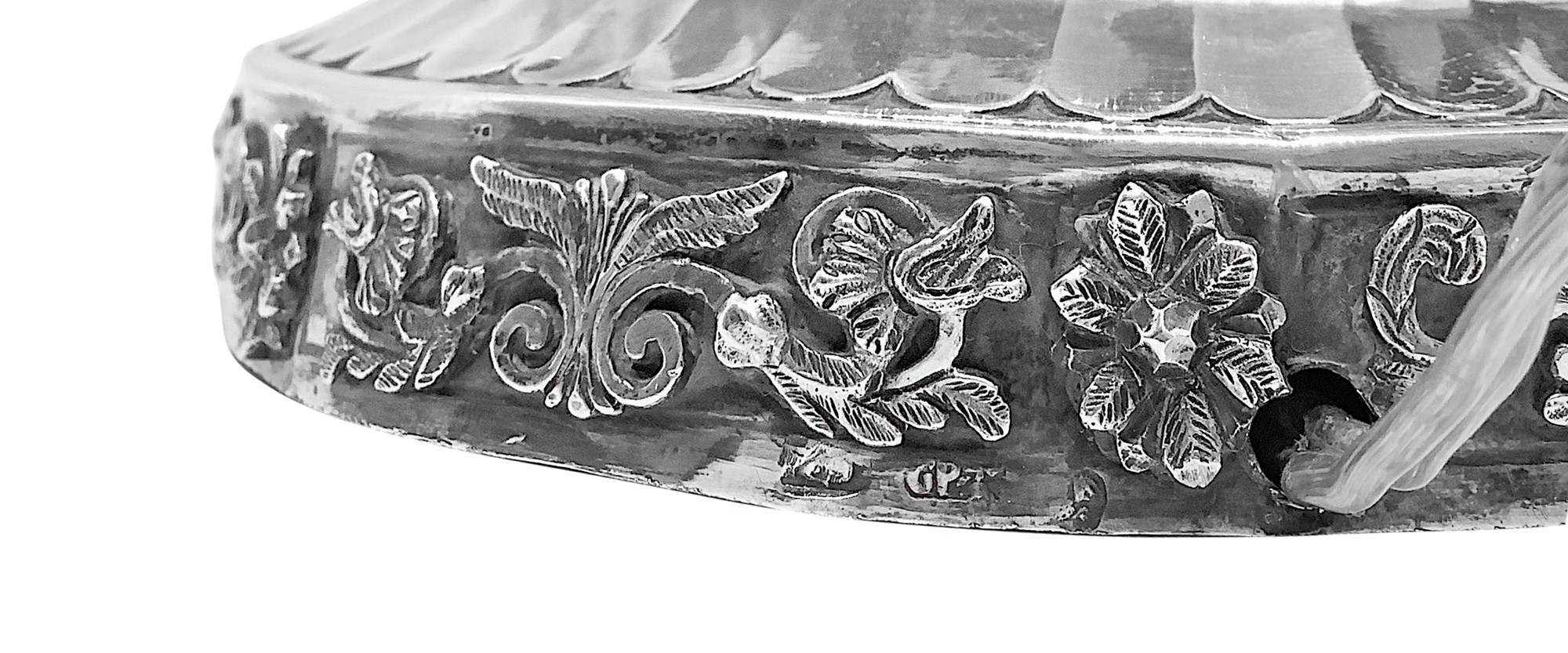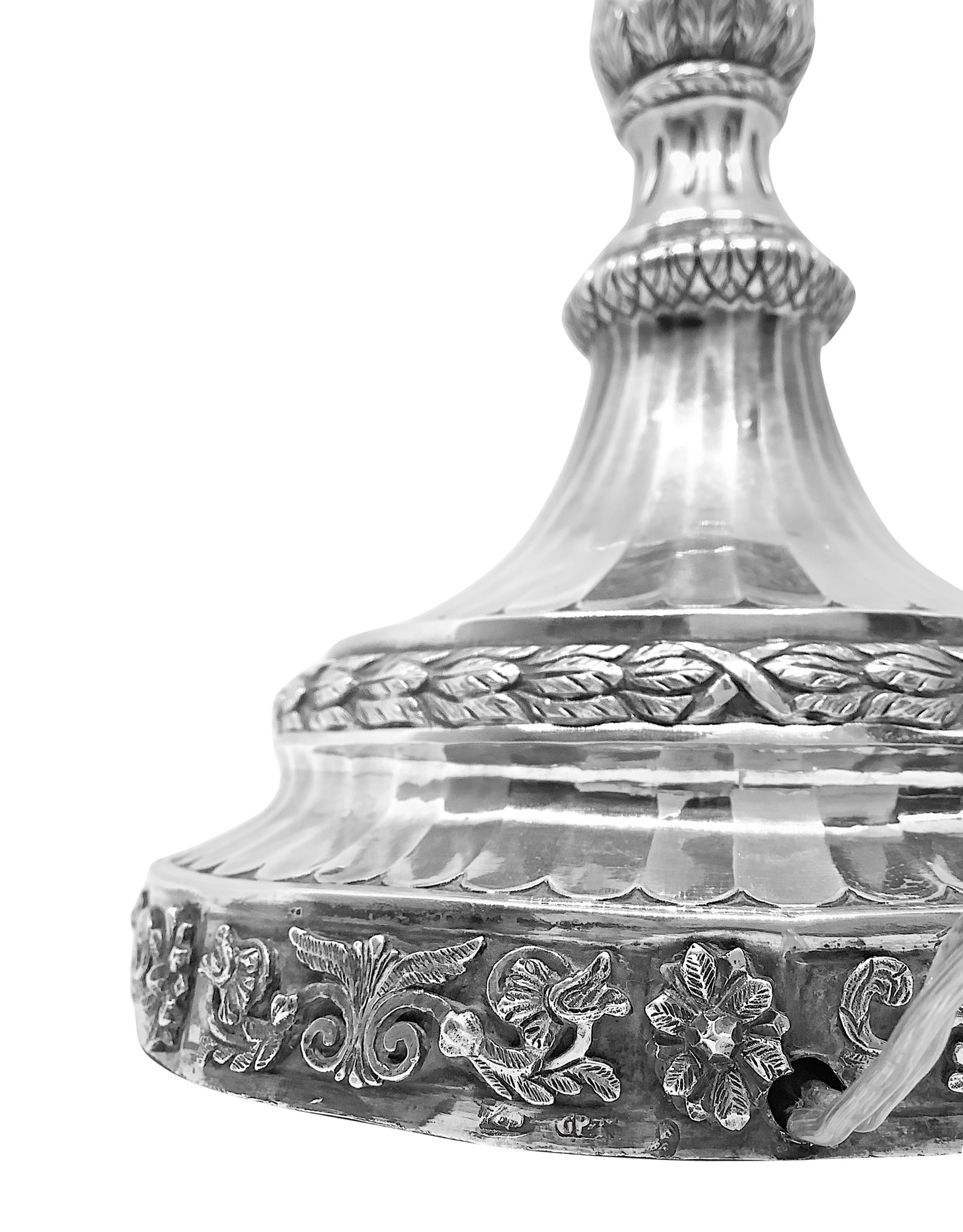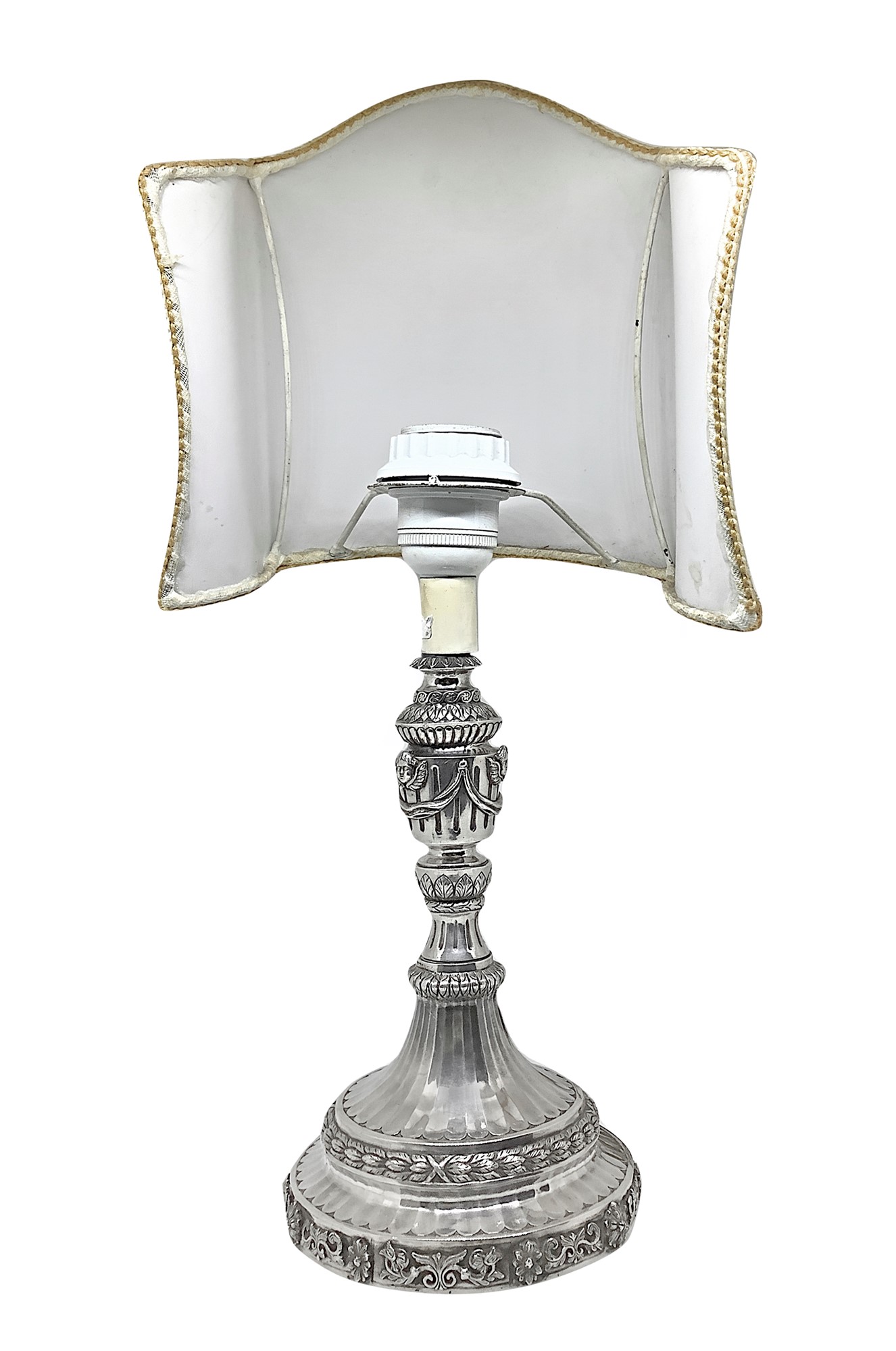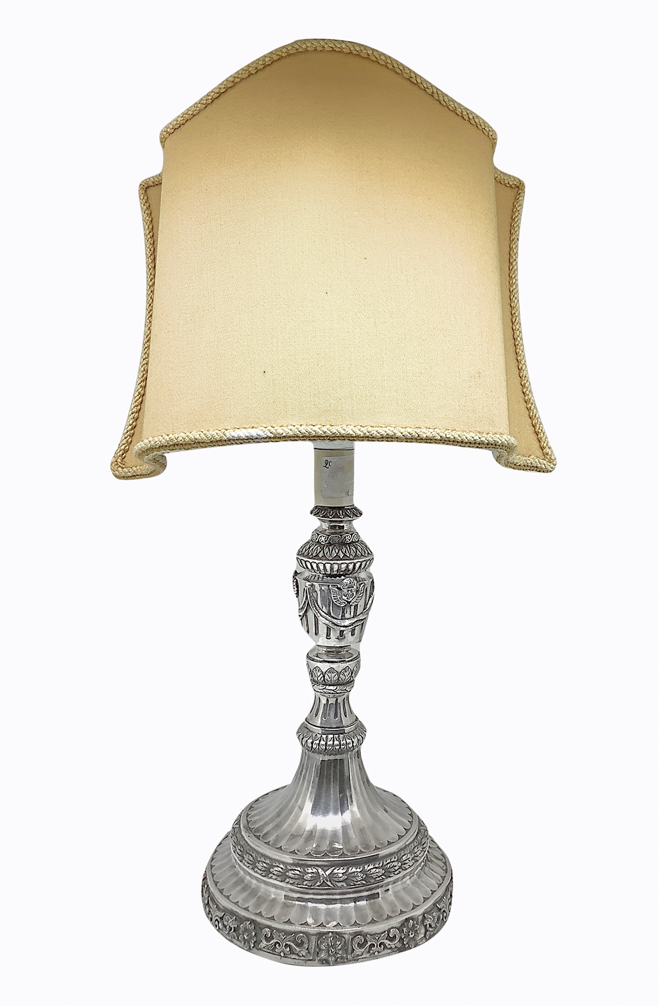 cm. 30 x 13, con ventola cm. 43 x 20 Lampada da tavolo con base in argento e ventola, Sbalzata con foglie d'acanto e cherubini.