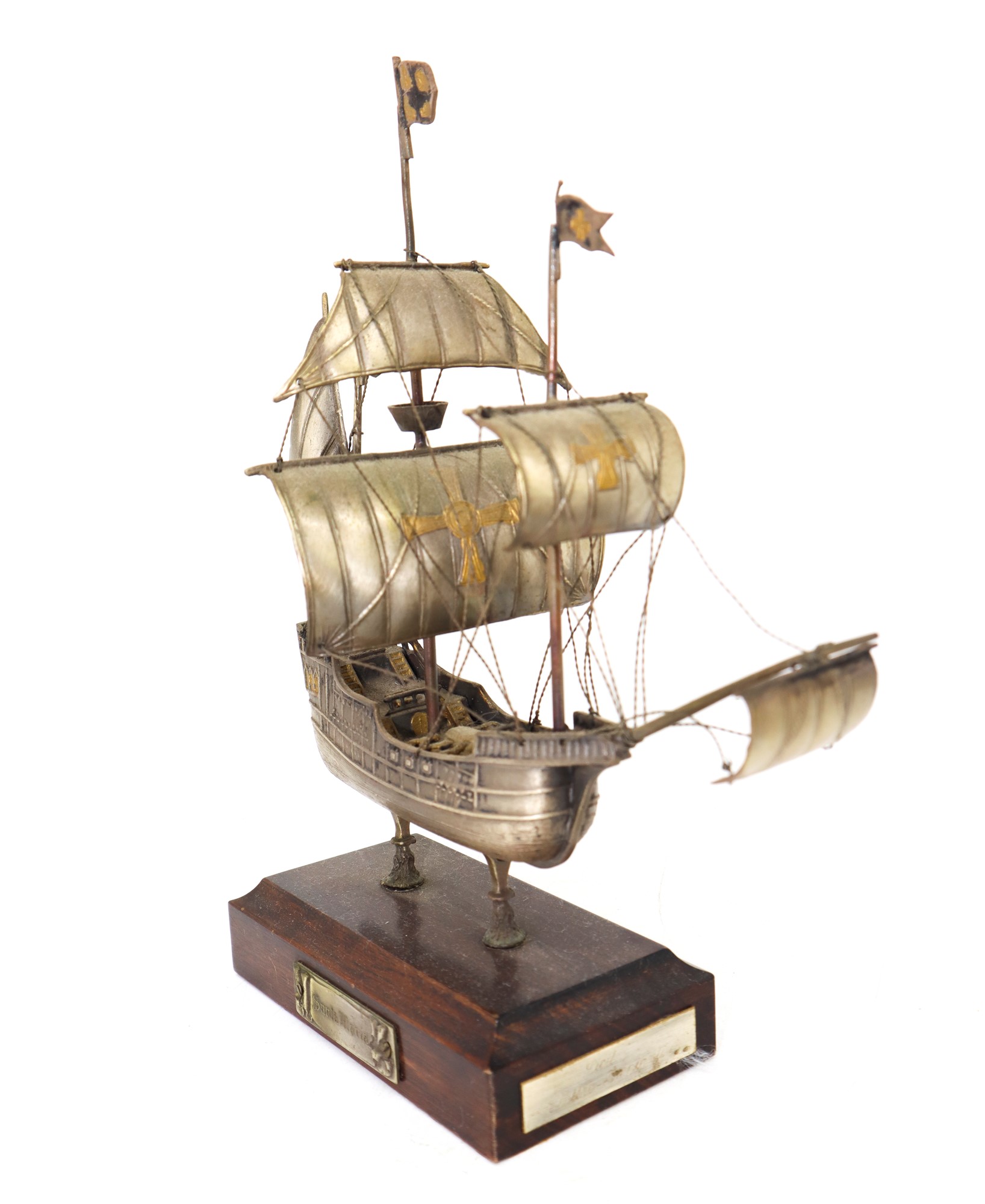 h cm 21, base cm 11 x cm 6 Caravella Santa Maria in argento A tre alberi, in argento con base in legno.