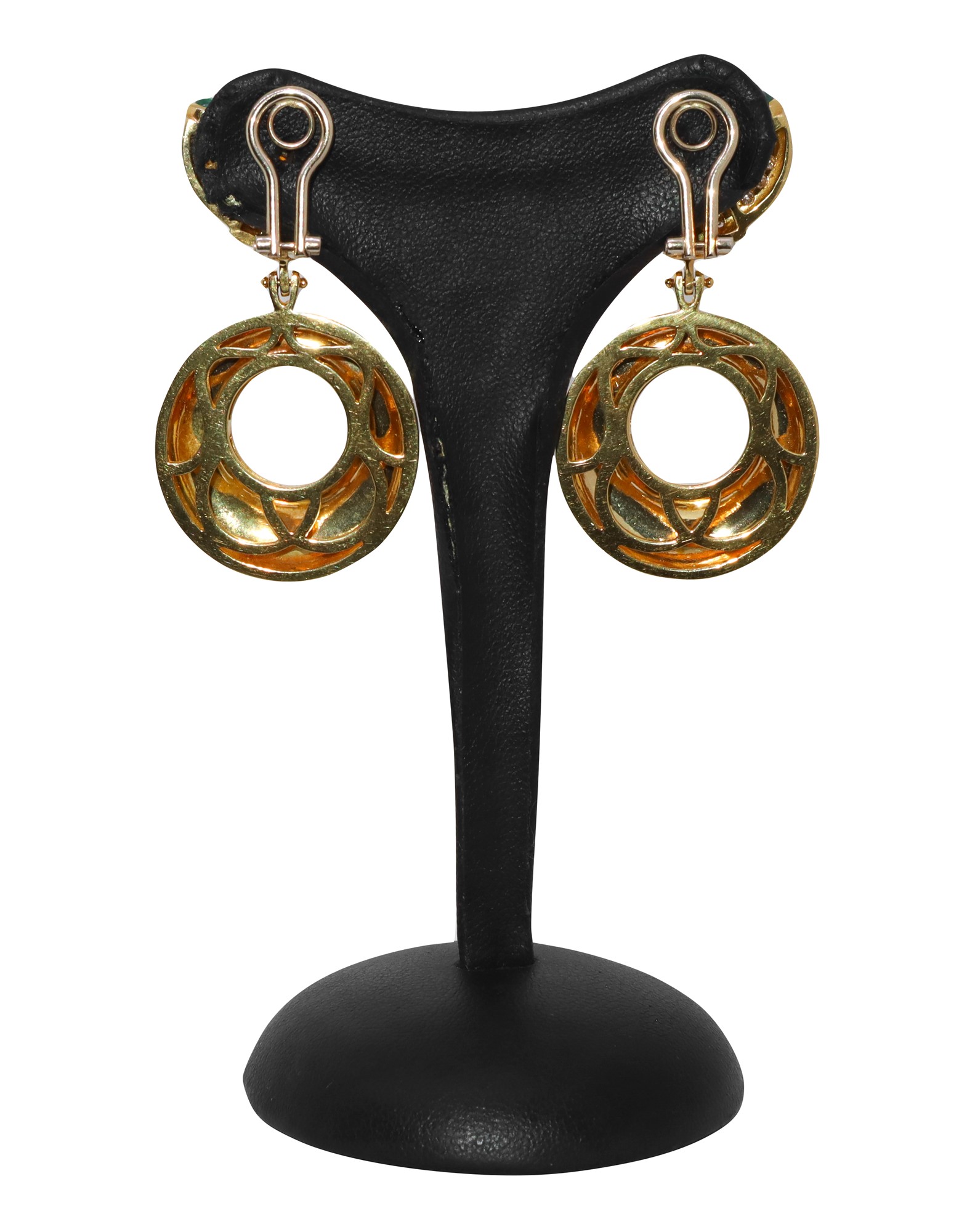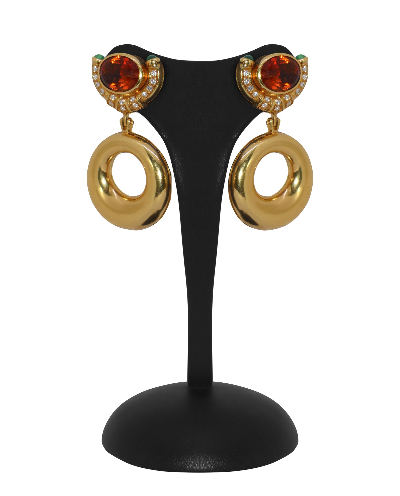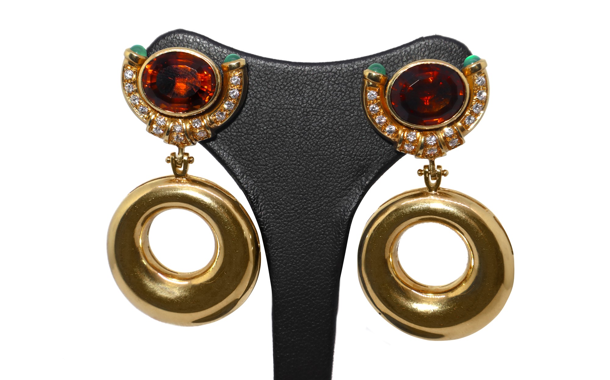 Lot 307 | Gr 33.3, lunghezza 5 cm Orecchini in oro giallo 18 kt, topazio madeira, smerladi cabochon, diama