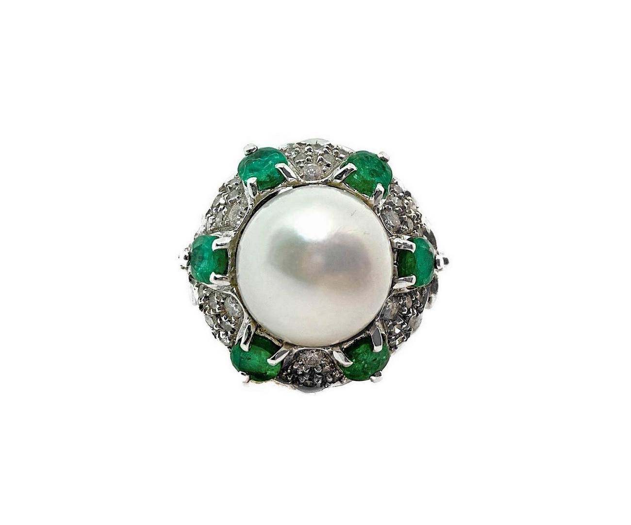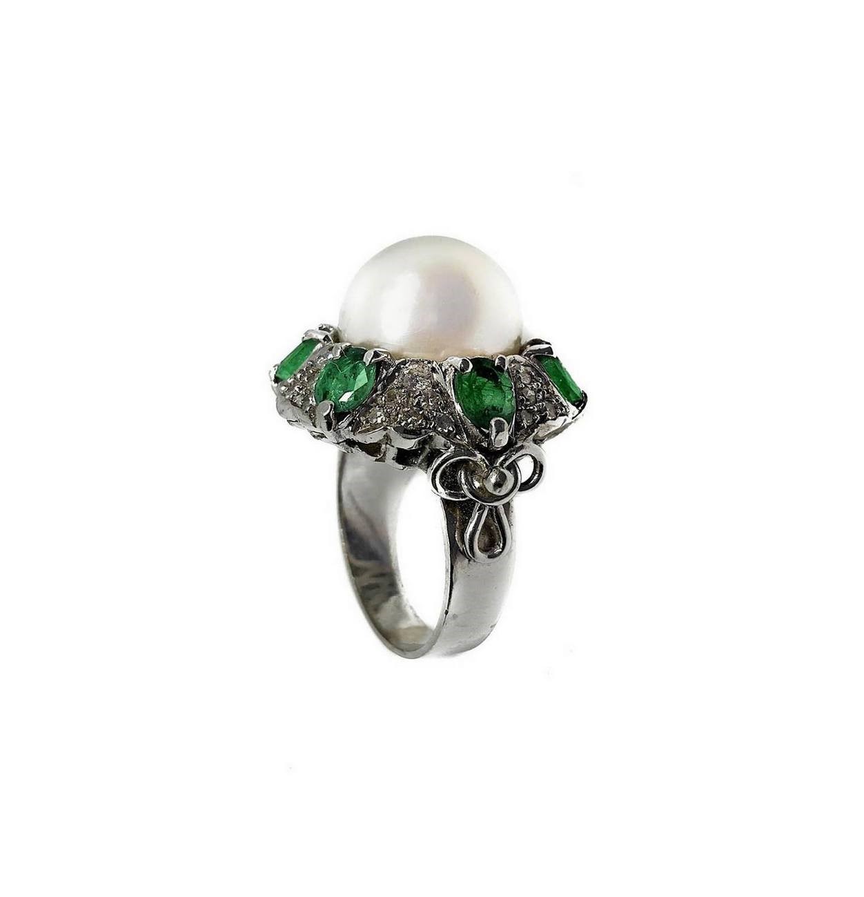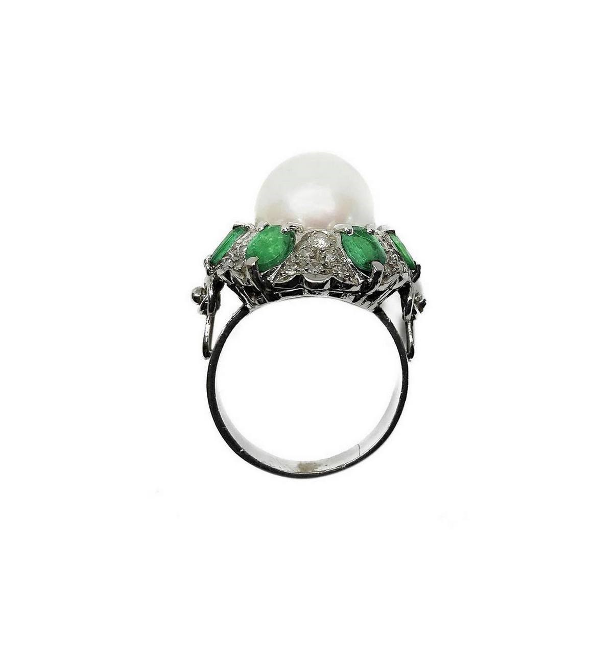 Anello in oro bianco con perla, brillanti e smeraldi. Gr 11.7 Grande perla centrale, smeraldi in