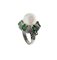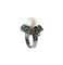 Anello in oro bianco con perla, brillanti e smeraldi. Gr 11.7 Grande perla centrale, smeraldi incastonati da piccoli brillanti.