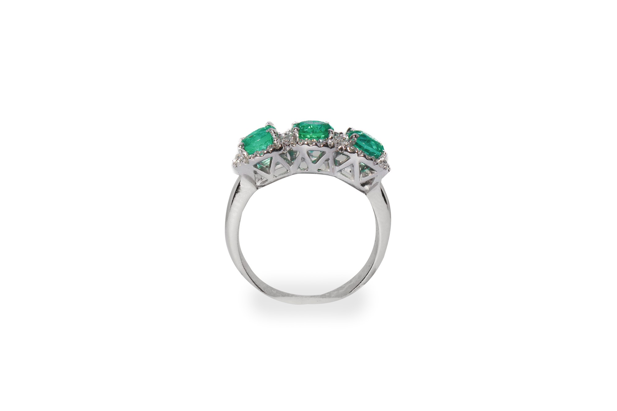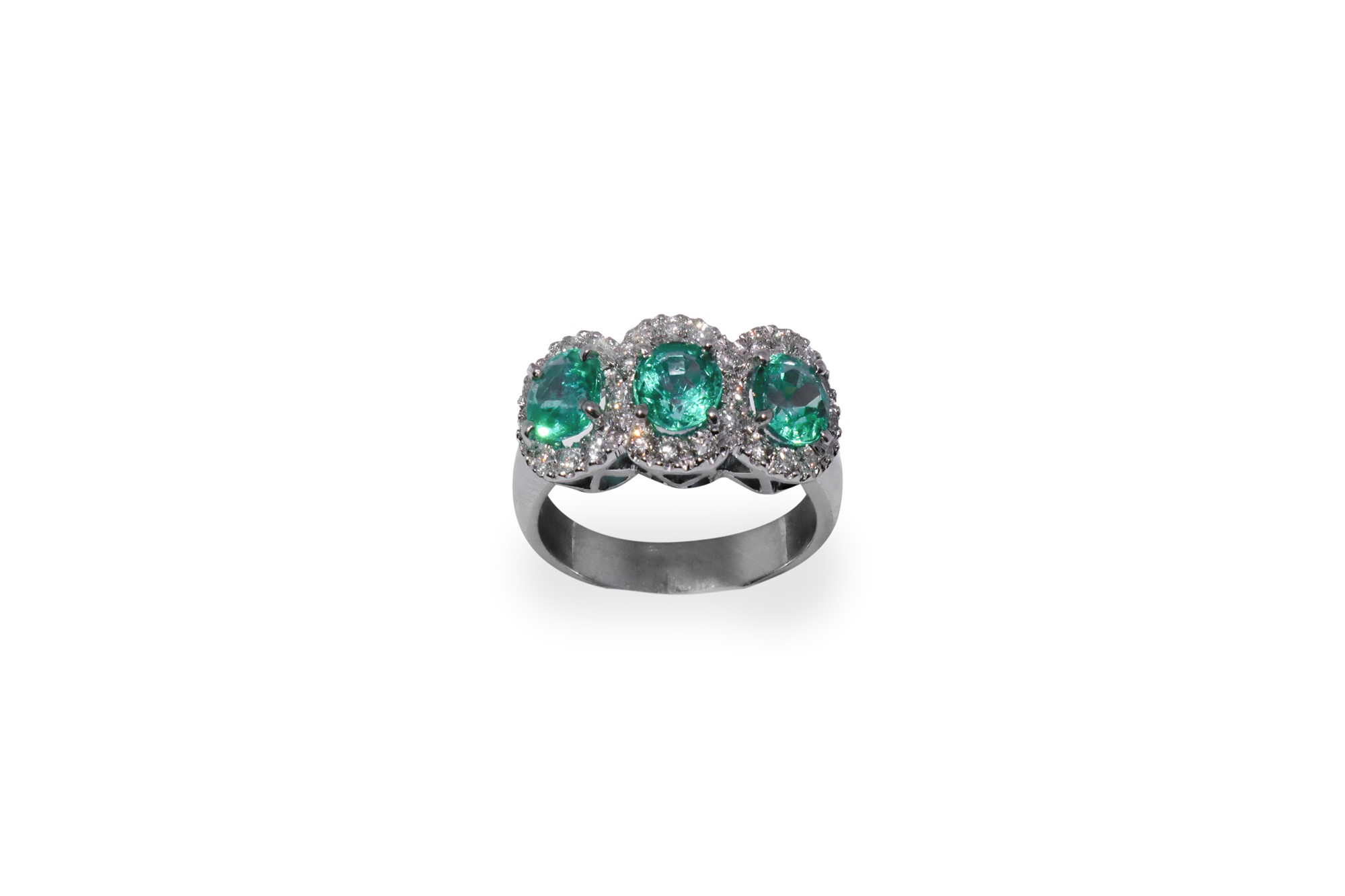 Gr 6,15 Anello trilogy in oro bianco con smeraldi Smeraldi naturali, trattamento con oli consentiti, ct 2, diamanti taglio brillante colore F, purezza VS , CT 0,60. Realizzato a mano.