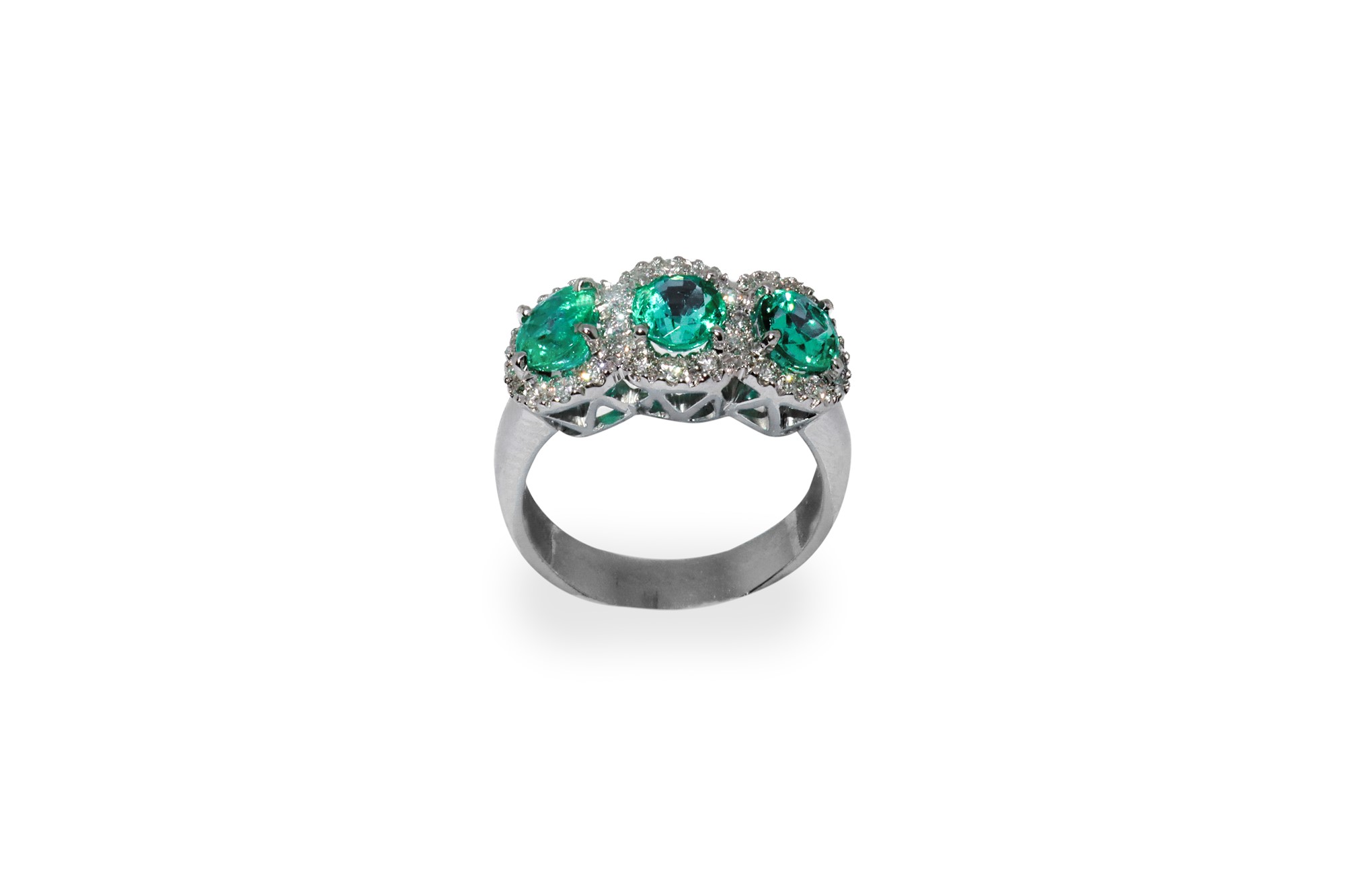 Gr 6,15 Anello trilogy in oro bianco con smeraldi Smeraldi naturali, trattamento con oli consent