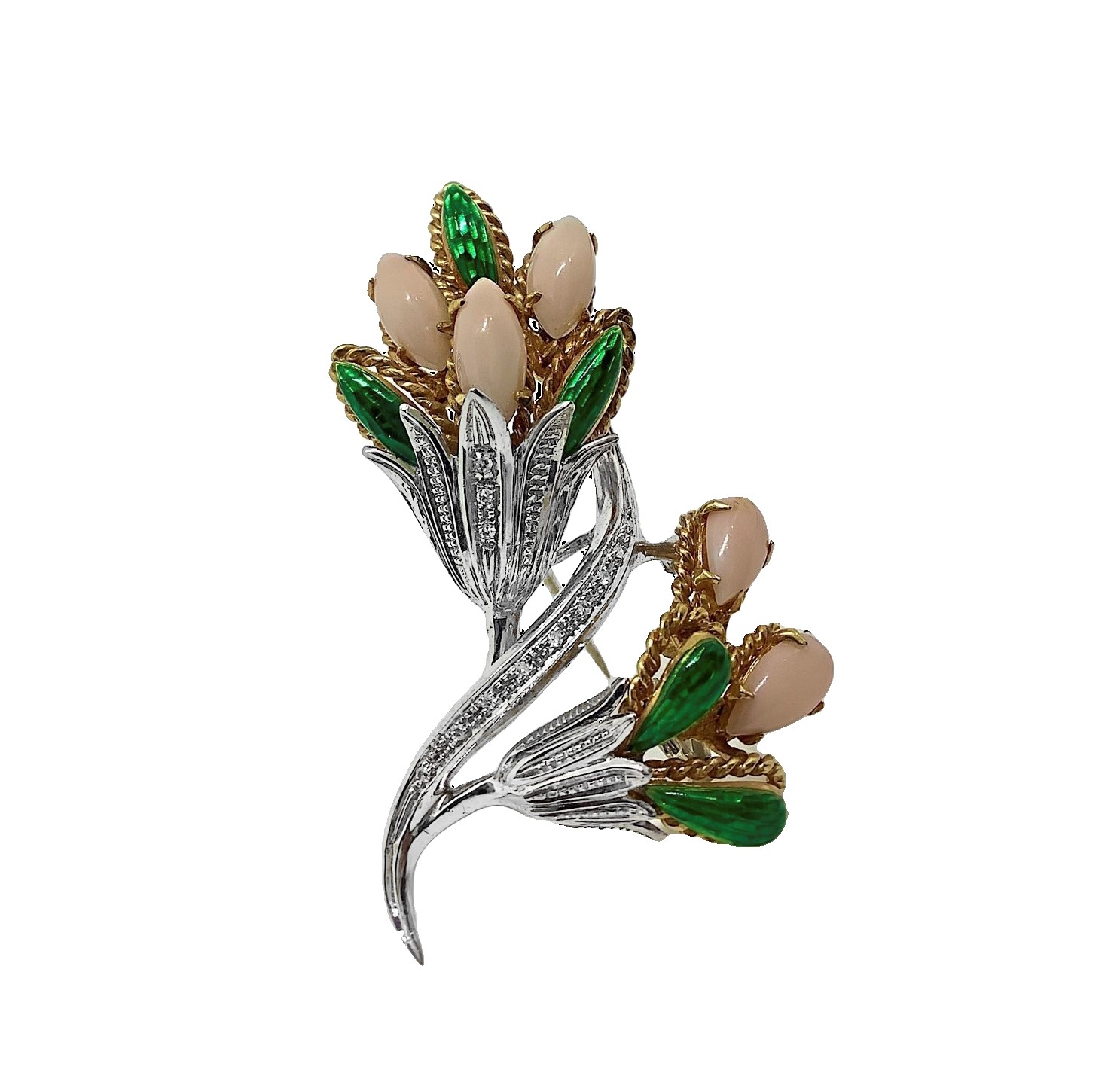 cm 5x3 spilla in oro bianco e oro giallo con scagliette di brillanti, smalti e corallo 18,2 gr.