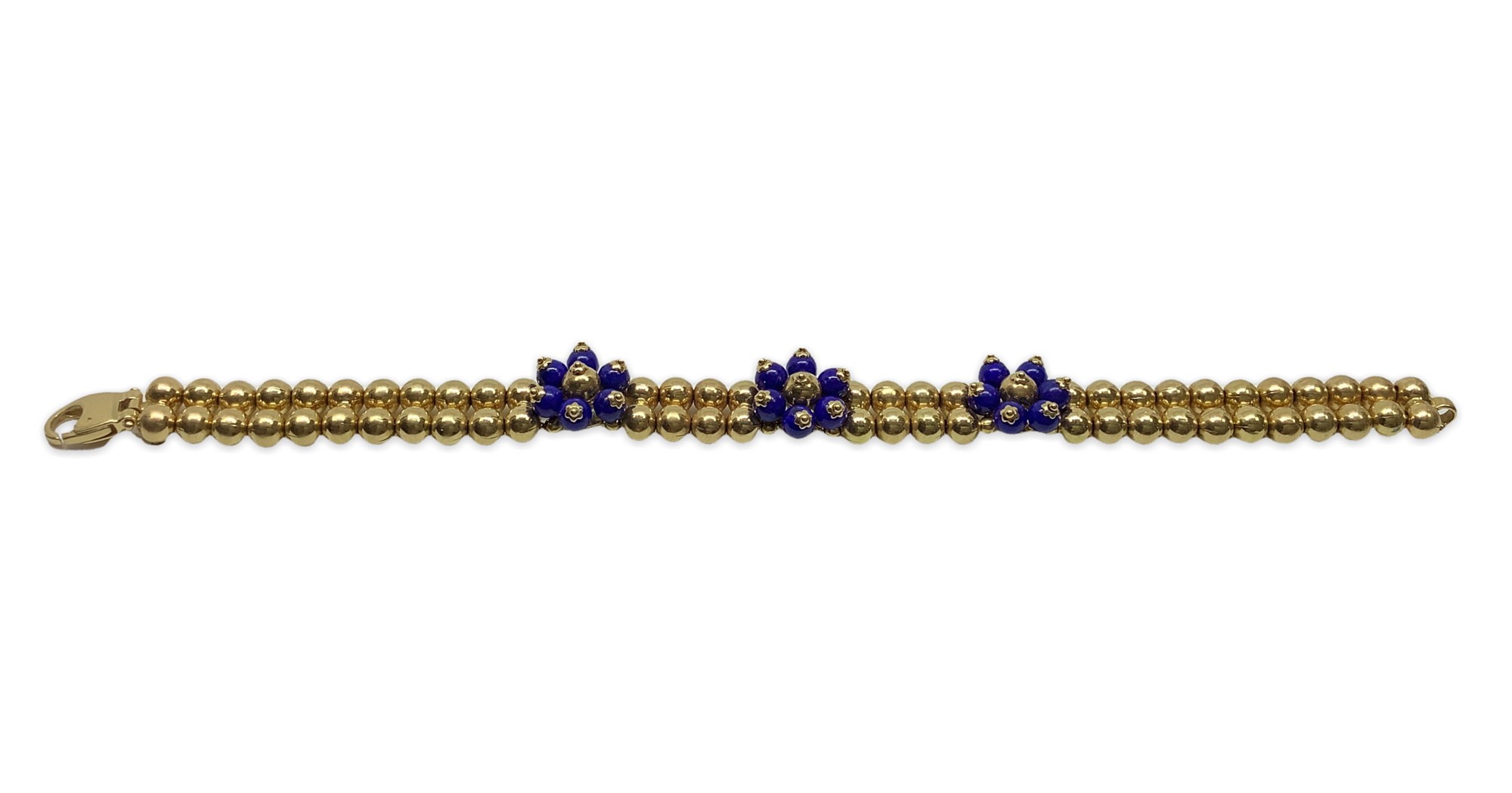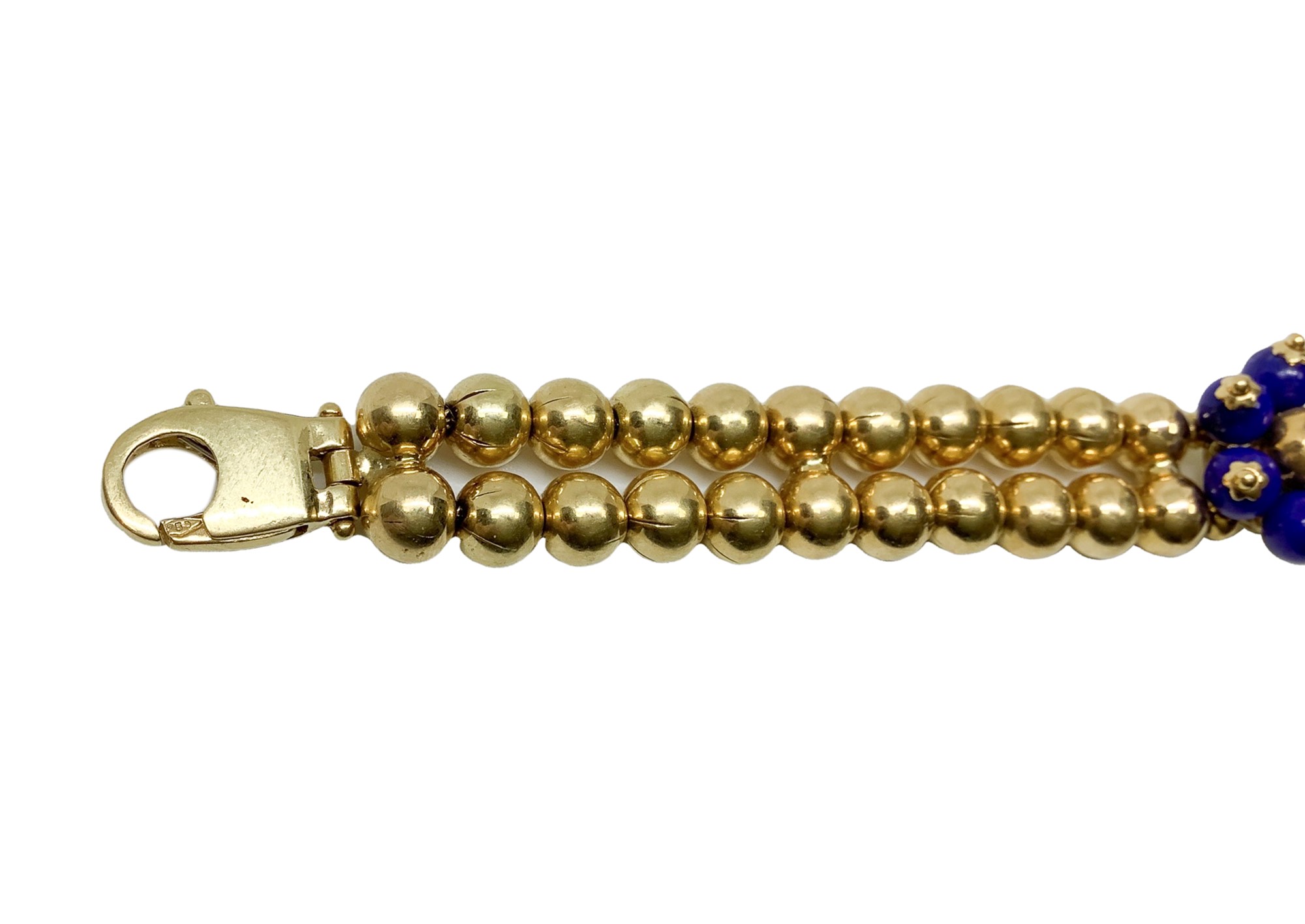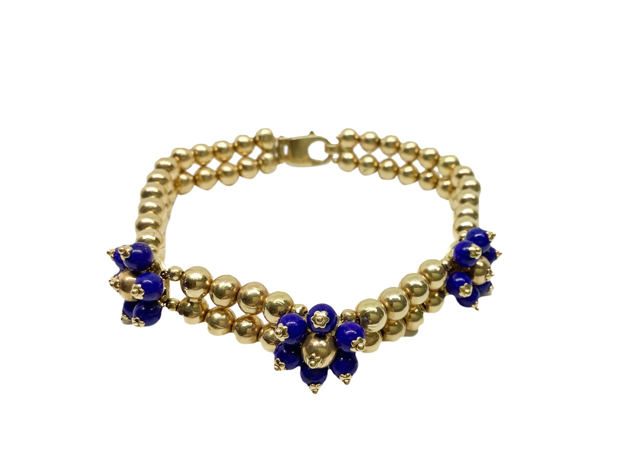29.1 gr. Bracciale a due fili a lavorazione a sfera di perline in oro giallo e pietre blu