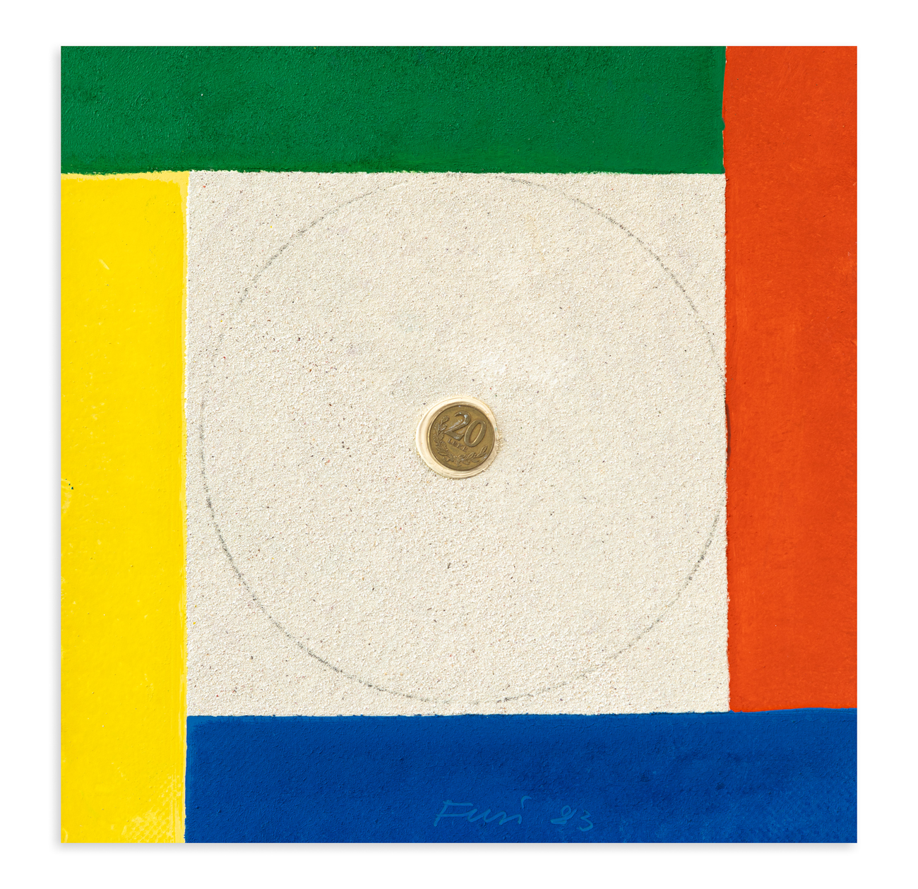 Tecnica mista, sabbia e applicazione di moneta su cartoncino